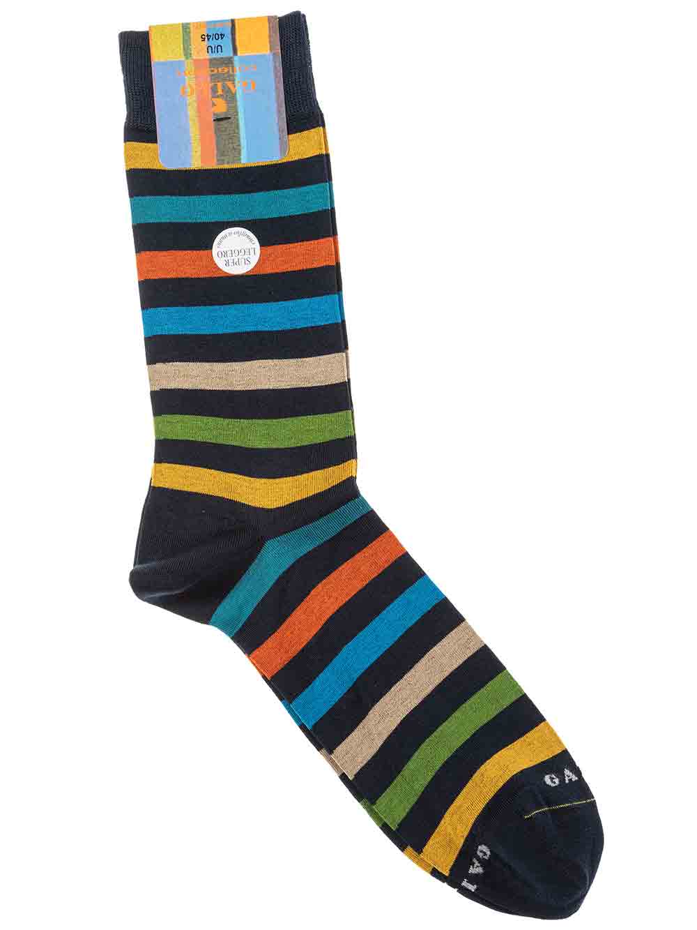 Calza uomo corto americano mezza gambetta in filo di scozia superleggero, fantasia righe multicolor sui toni del blu scurissimo/giallo/verde erba/beige/azzutto/arancio/ottanio. Scritta “Gallo” in punta in contrasto di colore. Modalità di lavaggio: Lavare a mano o in lavatrice a temperatura massimo 40°, no candeggio, asciugatura non a tamburo, non stirare. Taglia unica 40-45.