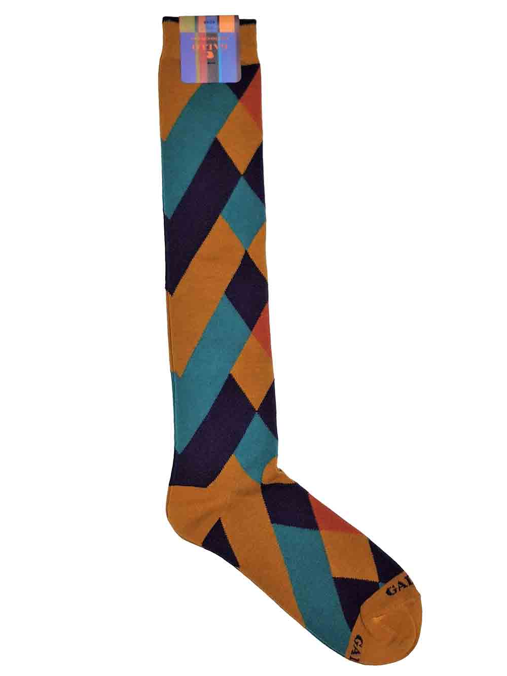 Calza uomo gambaletto maglia rasata in caldo cotone elasticizzato, fondo blu navy fantasia chevron più rombi sui toni del senape/verde petrolio/viola scuro/rosso mattone. Scritta “Gallo” in punta in contrasto di colore. Modalità di lavaggio: Lavare a mano o in lavatrice a temperatura massimo 40°, lavare a secco, no candeggio, asciugatura non a tamburo, non stirare. Taglia unica 40-45.