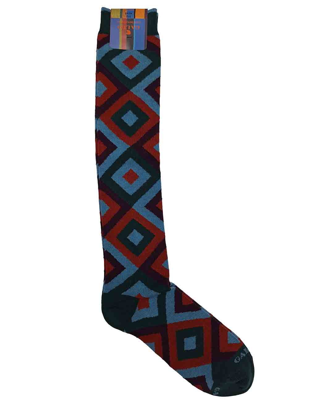 Calza uomo gambaletto maglia rasata in caldo cotone elasticizzato, fantasia new rombi sui toni del verde pino/celeste/vinaccia/rosso mattone. Scritta “Gallo” in punta in contrasto di colore. Modalità di lavaggio: Lavare a mano o in lavatrice a temperatura massimo 40°, no candeggio, asciugatura non a tamburo, non stirare. Taglia unica 40-45.