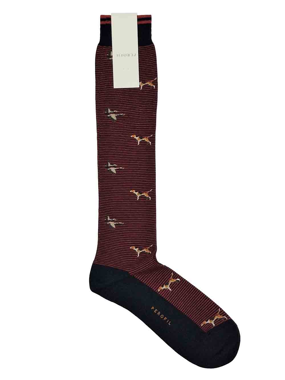 Calza uomo gambaletto maglia rasata in caldo cotone elasticizzato, fantasia microrighe blu/bordeaux più anatre/cani sui toni del marrone scuro/zucca/avana.