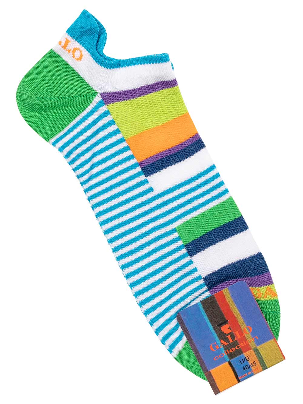 Calzino uomo cortissimo pariscarpa in filo di scozia fantasia righe multicolor sui toni del bianco/lime/arancio/viola/blu/azzurro/verde, dietro salvatallone, taglia unica 40-45.