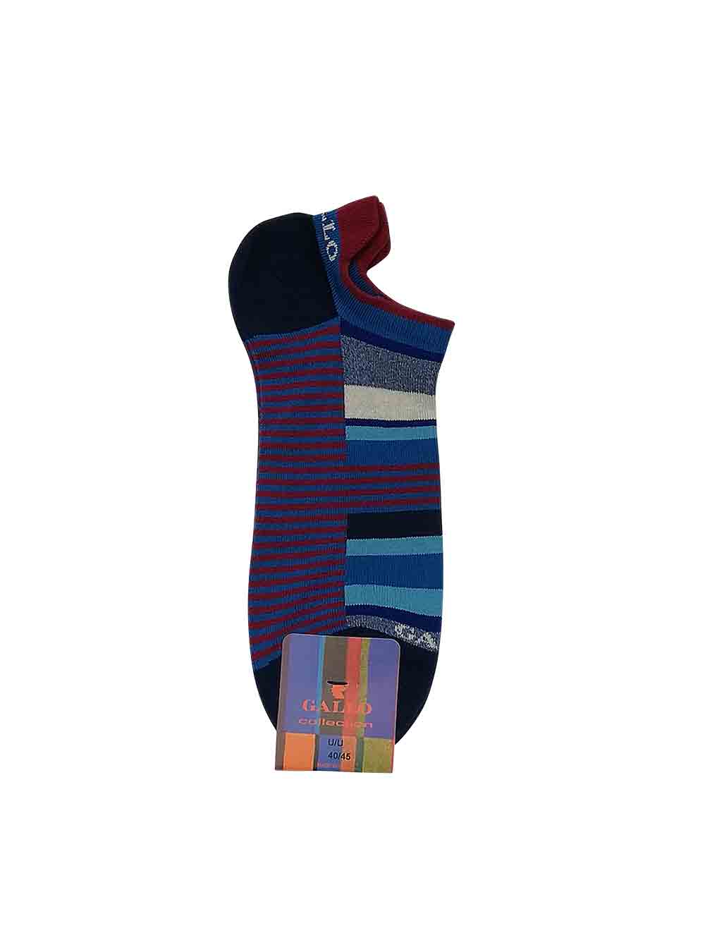 Calzino uomo cortissimo pariscarpa in filo di scozia fantasia righe multicolor sui toni del blu/vinaccia/azzurro/bluette/denim melange/bianco. Scritta “Gallo” in punta in contrasto di colore. Modalità di lavaggio: Lavare a mano o in lavatrice a temperatura massimo 40°, no candeggio, asciugatura non a tamburo, non stirare. Taglia unica 40-45.