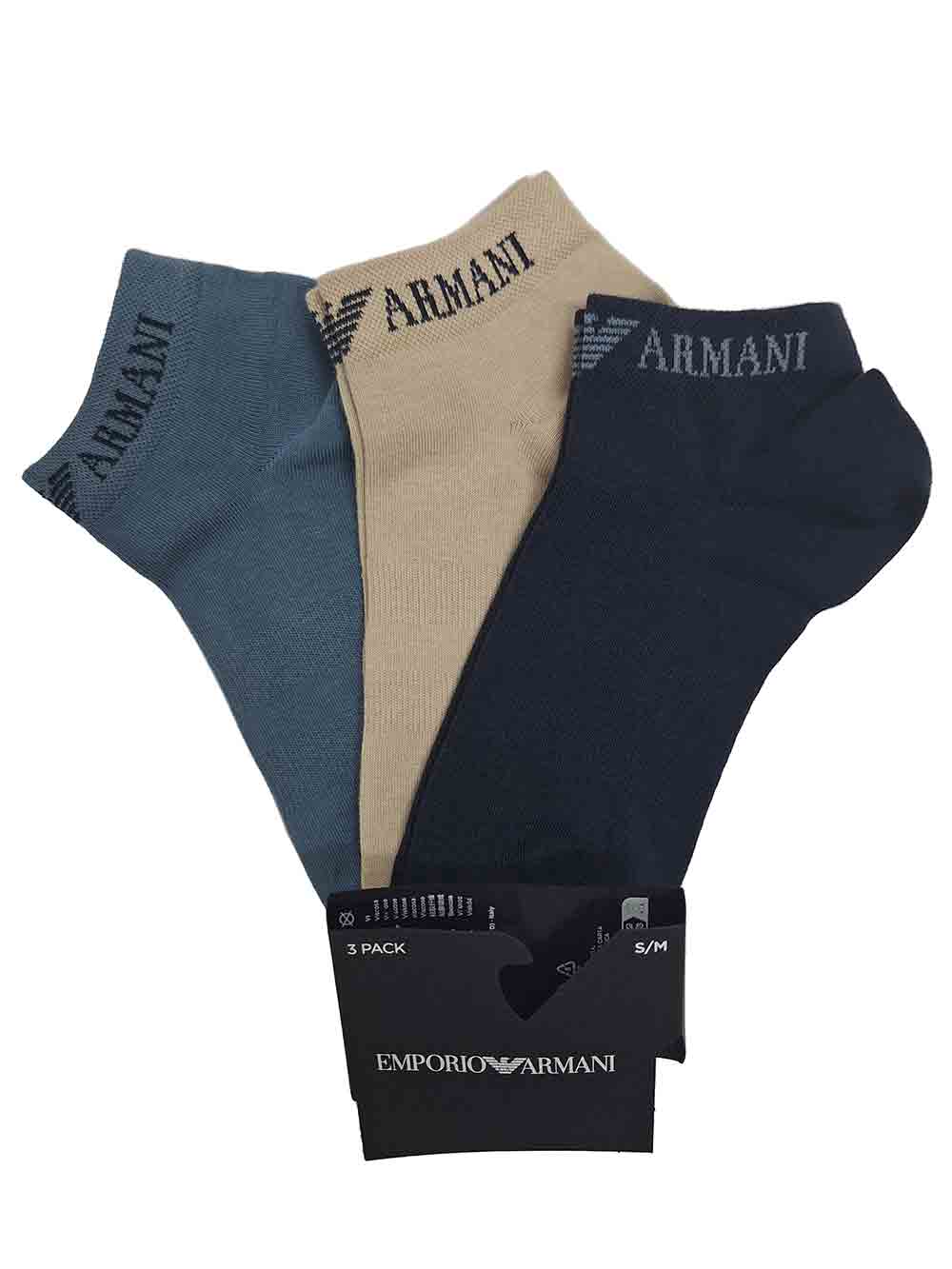 Calzino tripack corto caviglia uomo in cotone elasticizzato sportivo composto da: un pezzo blu con logo caviglia denim; un pezzo avana con logo caviglia blu; un pezzo denim con logo caviglia blu.