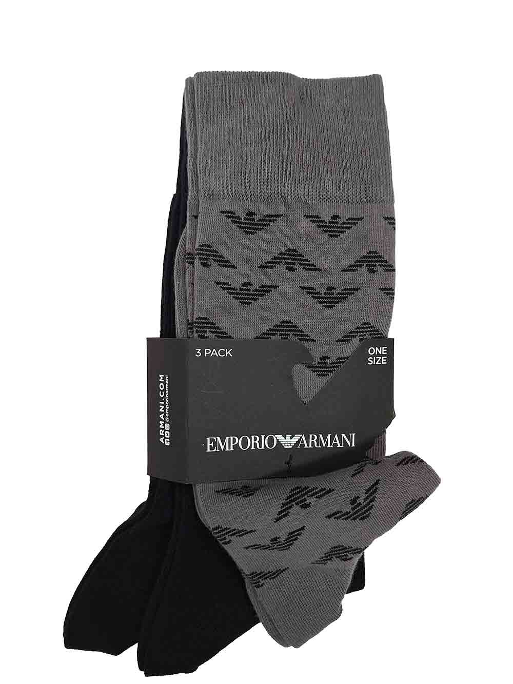 Tripack calzino corto americano mezza gambetta uomo in cotone elasticizzato composto da tre pezzi: due pezzi neri unito con logo grigio in alto; un pezzo color grigio medio logato con aquilotti neri. Taglia unica 40-45.