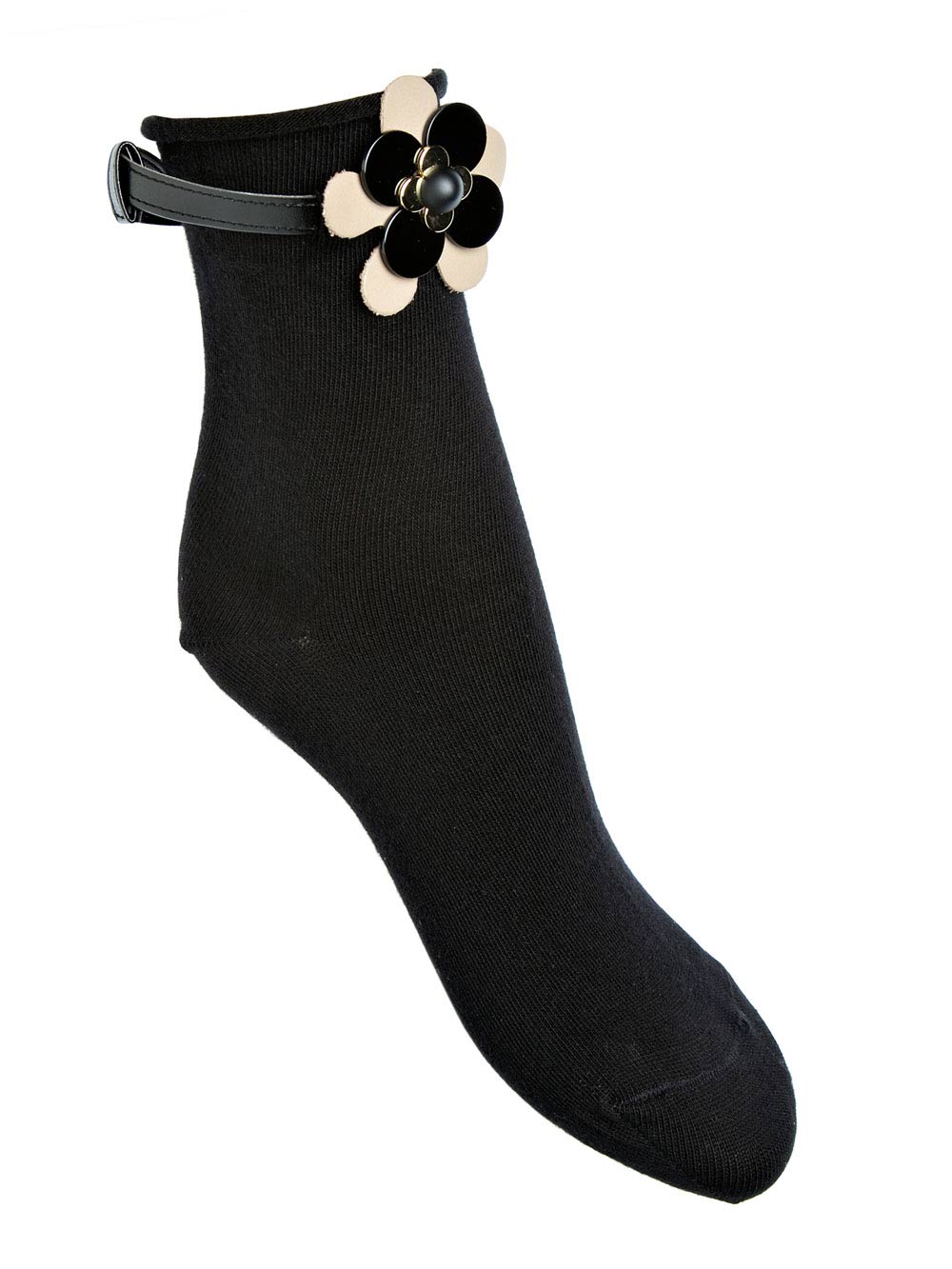 Calzino nero in cotone elasticizzato, rifinitura fine calzino a rotolino (no stringente), con cinturino girocaviglia in ecopelle rifinitio con fiore accessorio in plastica e metallo dorato.