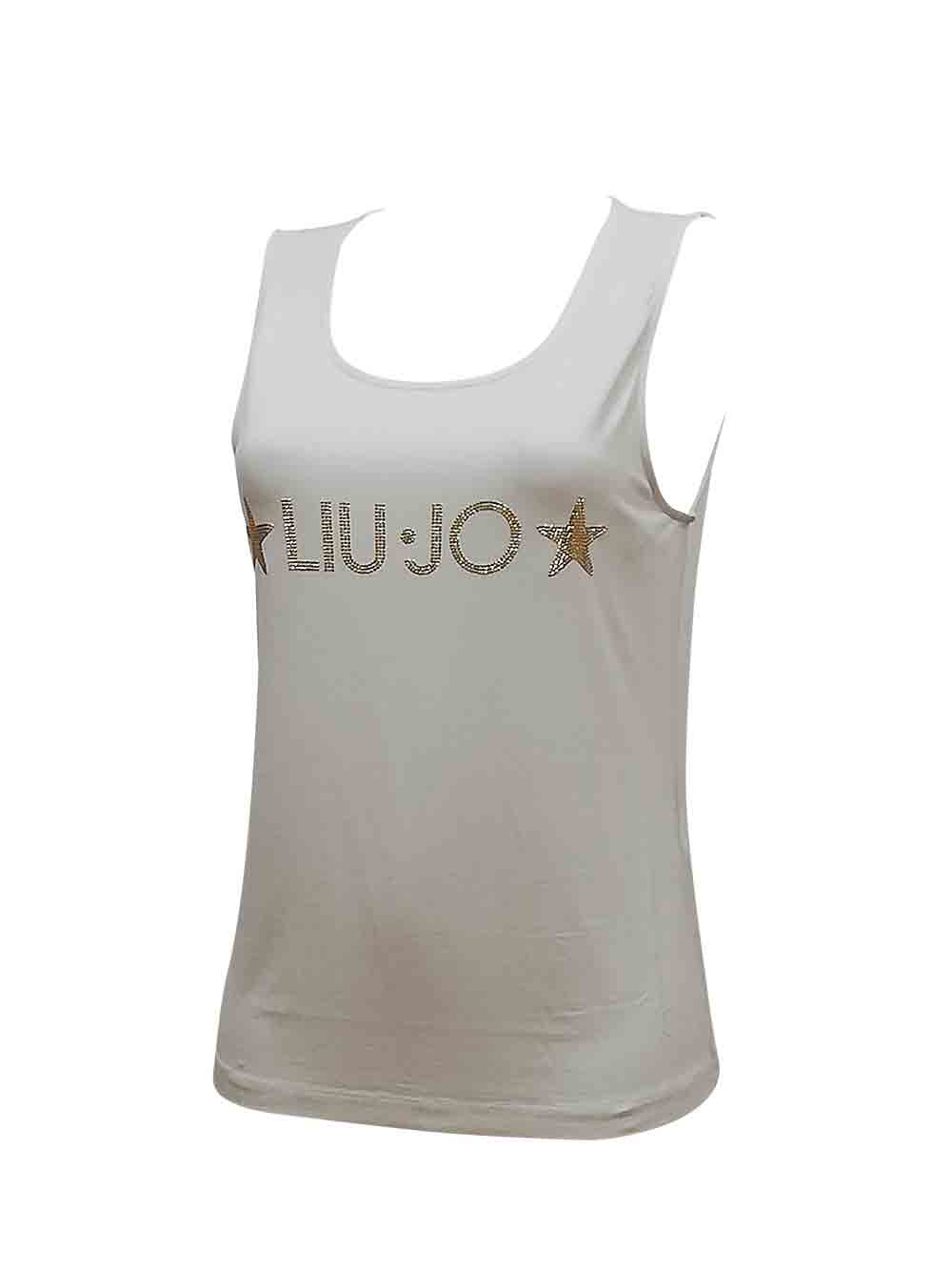 Canottiera donna bianca in morbidissima e cascante viscosa, spalla larga, scollatura rotonda, linea slim-fit semi modellata, sul davanti ricco logo con stelline in microborchiette dorate effetto gioiello.