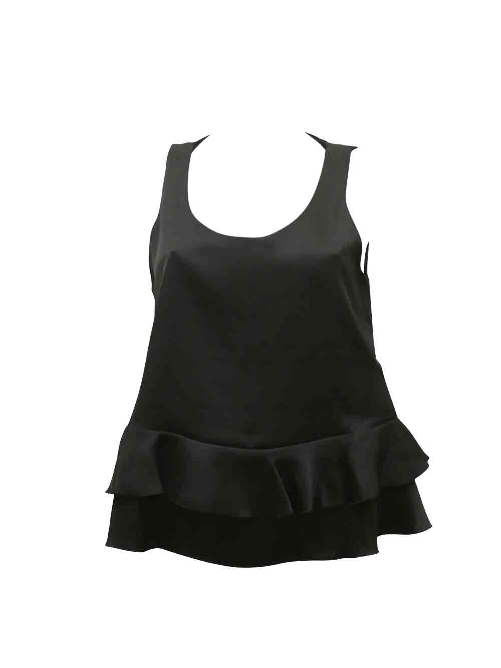 Canottiera/top nera donna in raso cady corposo e cascante semi opaco, accollata sul dietro, spalla semi larga, scollo rotondo, tutta doppiata nella parte del seno e dietro, forma svasata semi trapezio, lunghezza media, dal punto vita parte una doppia gala che dà un effetto ricco e svasato, linea elegante anche per cerimonia.