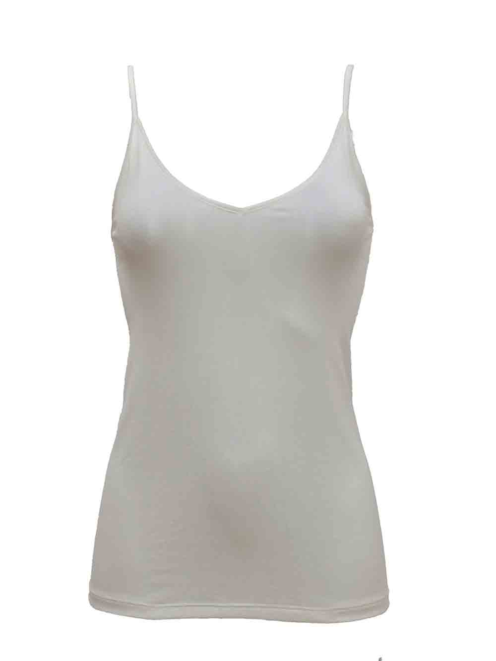 Canottiera intima donna color bianco ottico in misto viscosa, molto elastica e morbida no compressione, spallino stretto regolabile, leggero scollo V sul davanti, pari sul dietro, tutta profilata con raso elastico su tono.