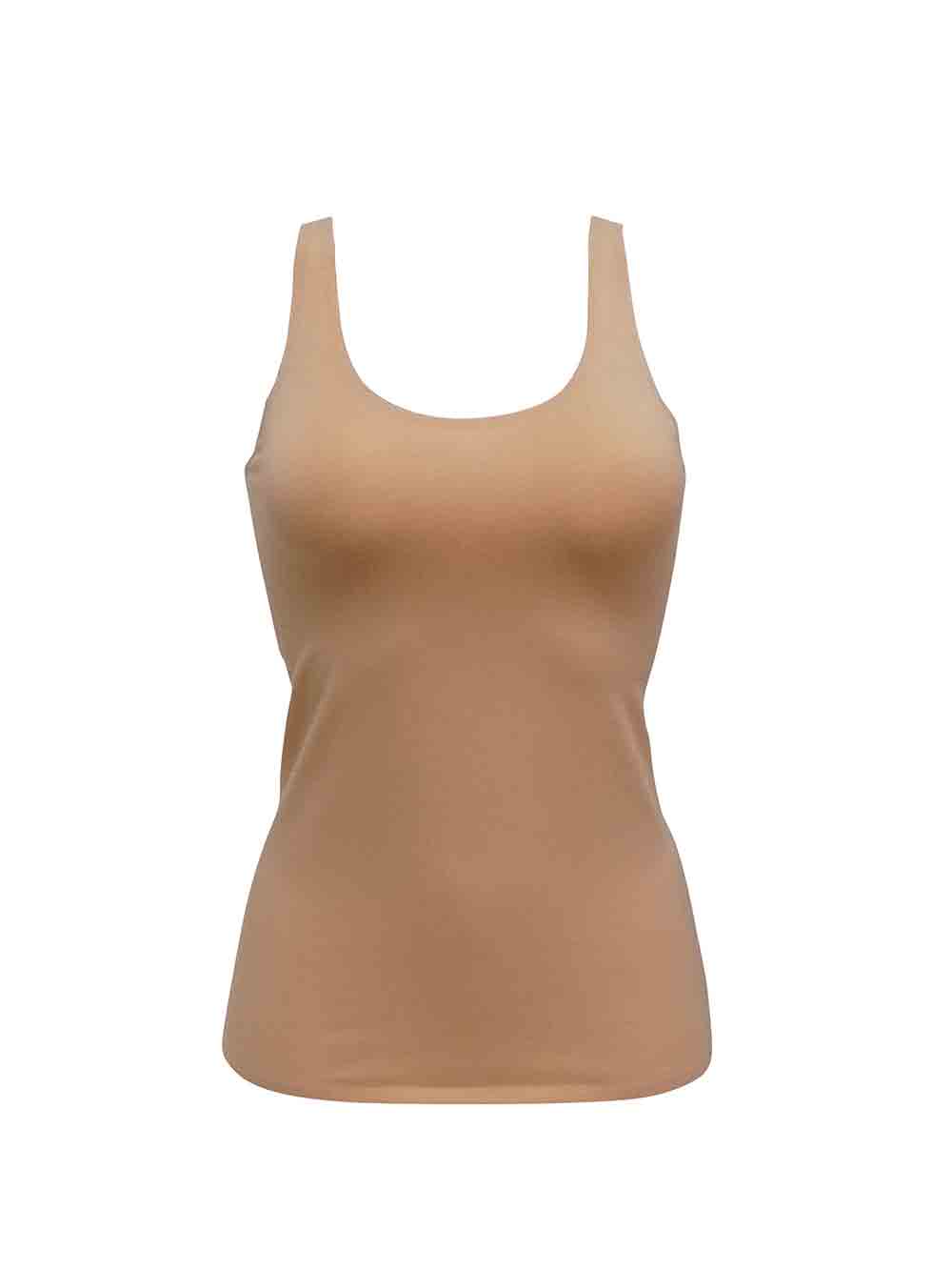 Canottiera intima donna in misto cotone e modal, color nude, mano molto morbida ed elasticizzata, tutta taglio laser termosaldato sulla parte alta e sul fondo finale, spalla medio-larga, scollo rotondo sul davanti e sul dietro.