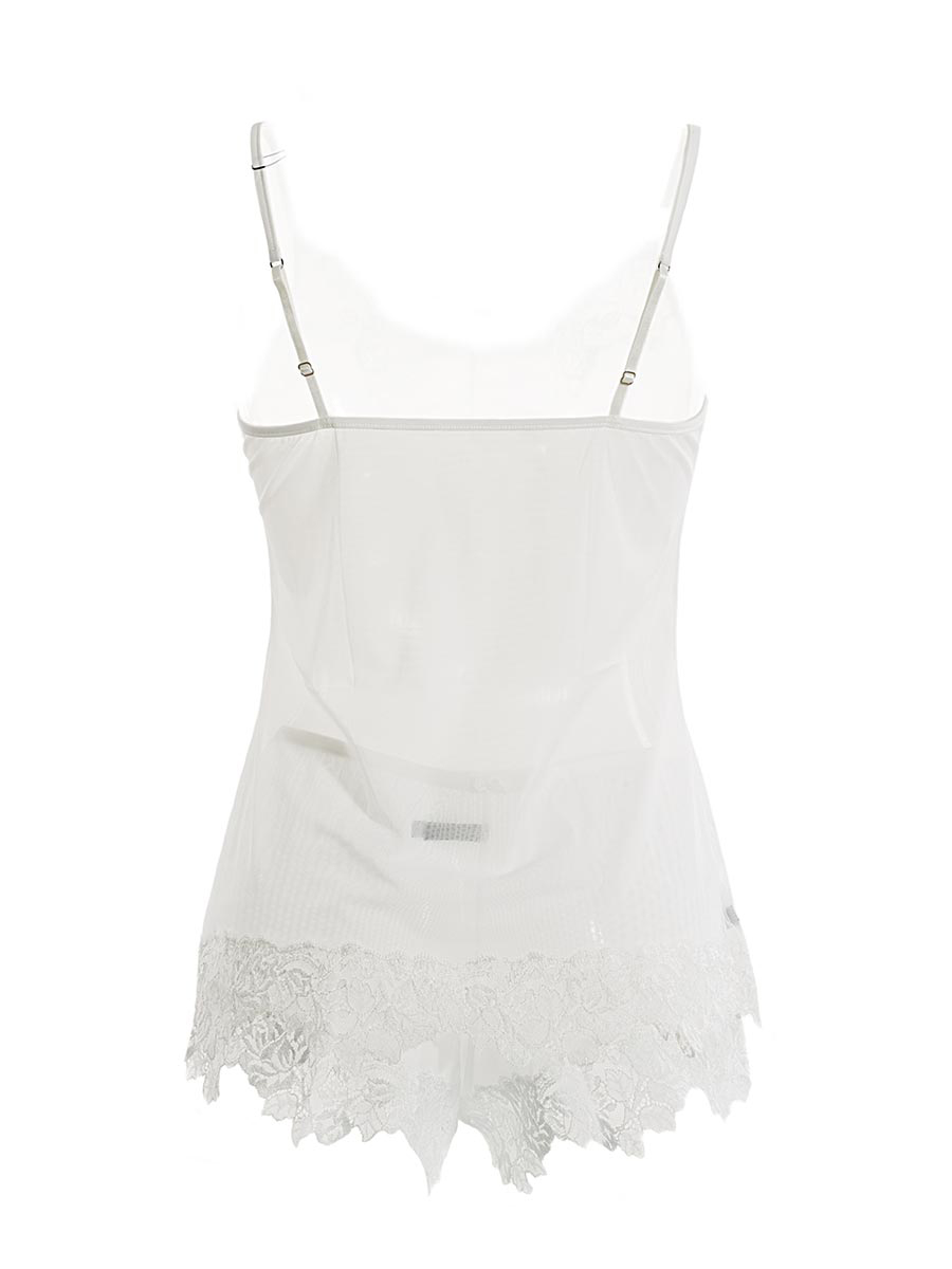 Top in toulle morbidissimo, spallini stretti regolabili, linea morbida. Pizzo elastico sul seno e nella parte finale dei fianchi.