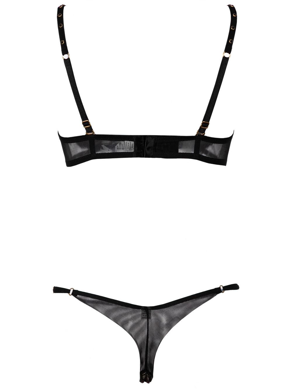 Completo intimo donna nero + lurex donna in pizzo e toulle elasticizzato stampa chevron sui toni del nero/ocra/bordeaux/cipolla/oro/beige composto da: reggiseno brassière con ferretto + mezza imbottitura fissa effetto triangolo, scollo fondo sul davanti, pizzo sottoseno + strass, spallini regolabili in toulle + strass neri, aggiancitura regolabile sul dietro; perizoma in pizzo e toulle, laccetti laterali regolabili sui fianchi, dietro piccolo.