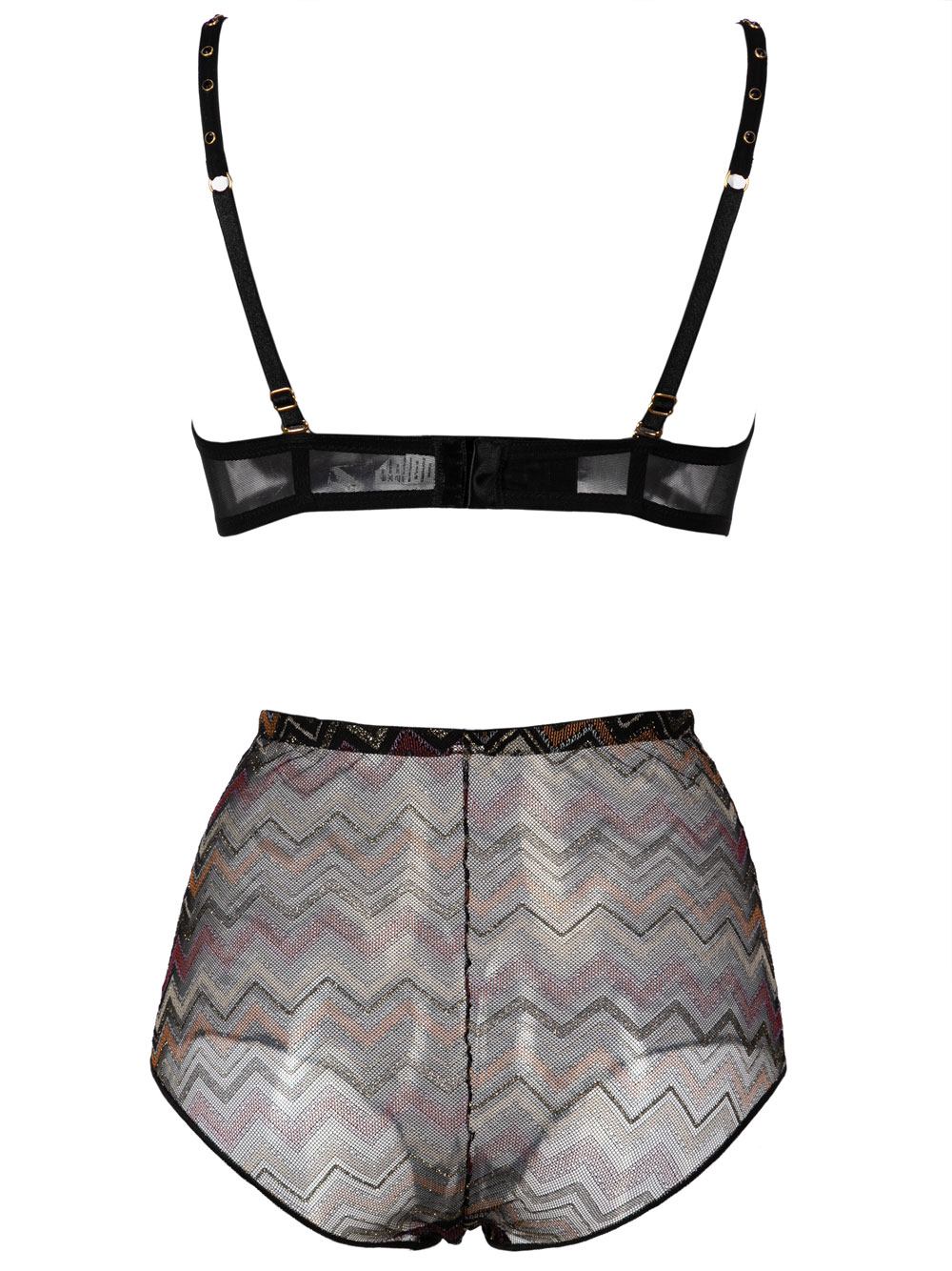 Completo intimo donna nero + lurex donna in pizzo e toulle elasticizzato stampa chevron sui toni del nero/ocra/bordeaux/cipolla/oro/beige composto da: reggiseno brassière con ferretto + mezza imbottitura fissa effetto triangolo, scollo fondo sul davanti, pizzo sottoseno + strass, spallini regolabili in toulle + strass neri, aggiancitura regolabile sul dietro; slip moda alto vita tutto in pizzo/toulle, cucitura centrale sul retro, strass puntovita sul davanti.