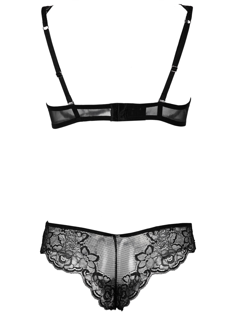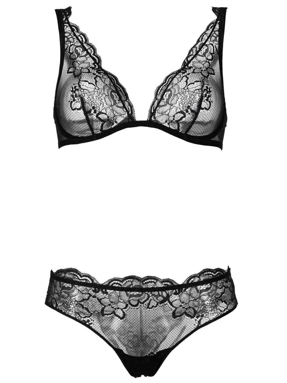 Completo intimo donna nero in pizzo elasticizzato composto da: reggiseno leggero con ferretto memory new effetto spingiseno, in pizzo leggero, scollo profondo sul davanti, spallino largo a canotta regolabile sul dietro, fianchetto torace in toulle leggero con agganciatura regolabile sul dietro; slip brasiliano tutto in pizzo sul davanti e sul retro, con cucitura centrale, pizzo finale, no cuciture, invisibile.