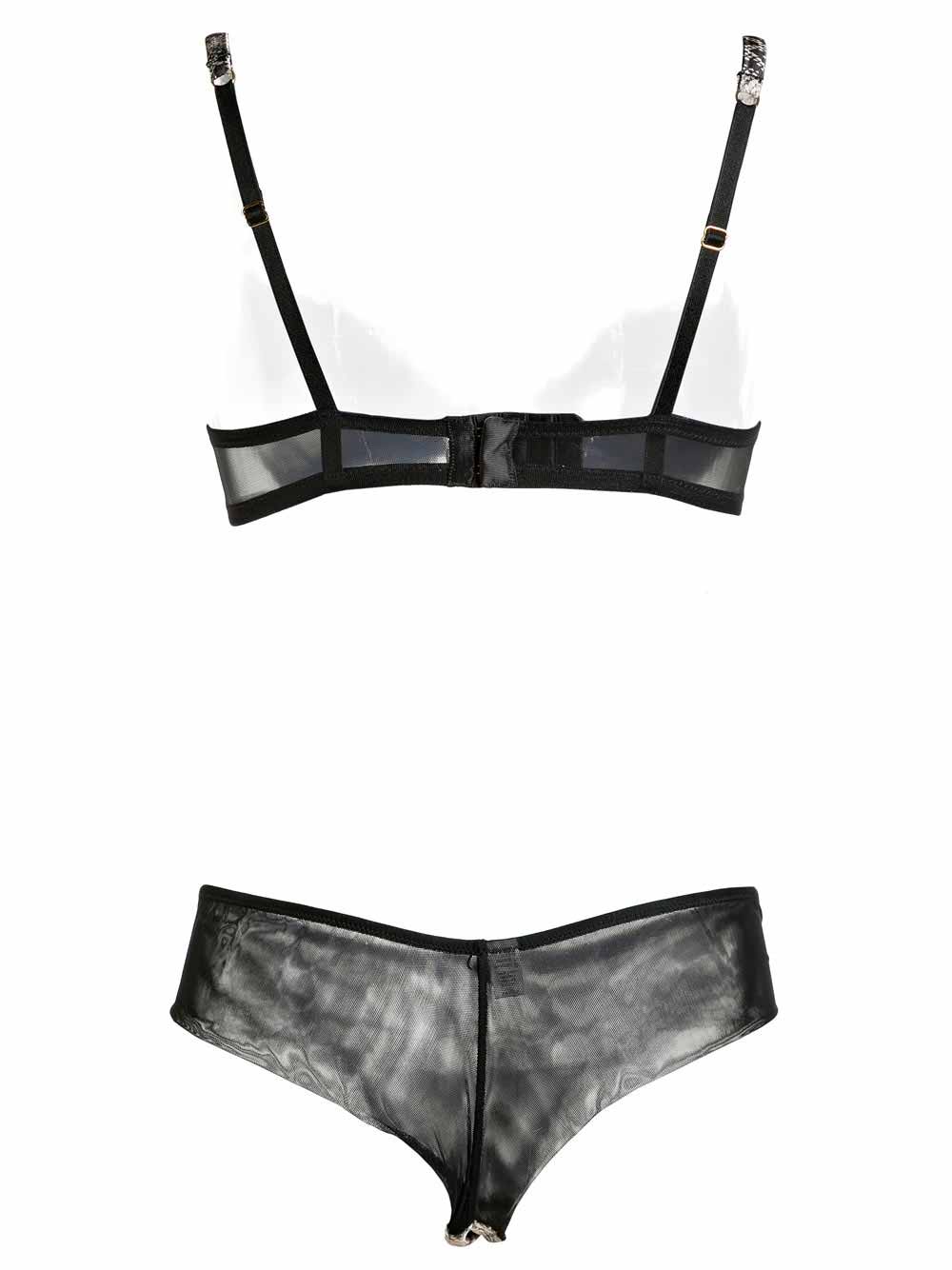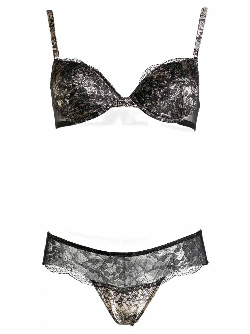 Completo intimo donna Valery, collezione Autunno Inverno 2017, composto da: reggiseno imbottito preformato push-up con pesciolini estraibili, coppe in raso pitonato, foderate di prezioso pizzo nero/dorato, spalline regolabili con toulle sul dietro; brasiliano: sul davanti nella parte bassa raso pitonato beige/nero, nella parte alta pizzo nero/dorato, mentre il dietro doppiato in toulle invisibile.
