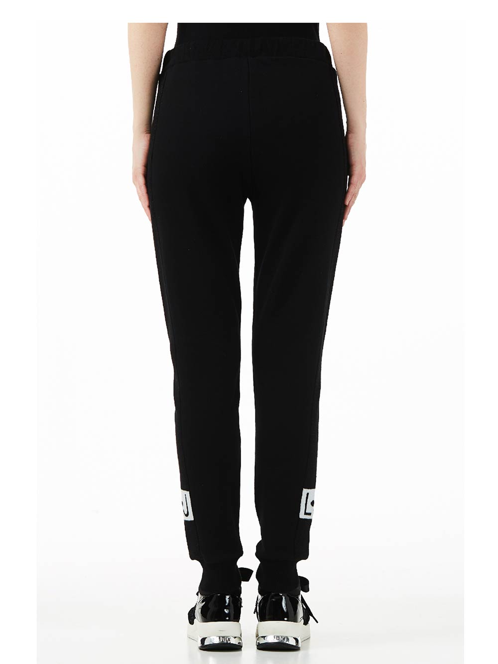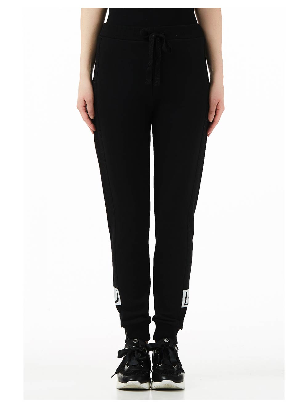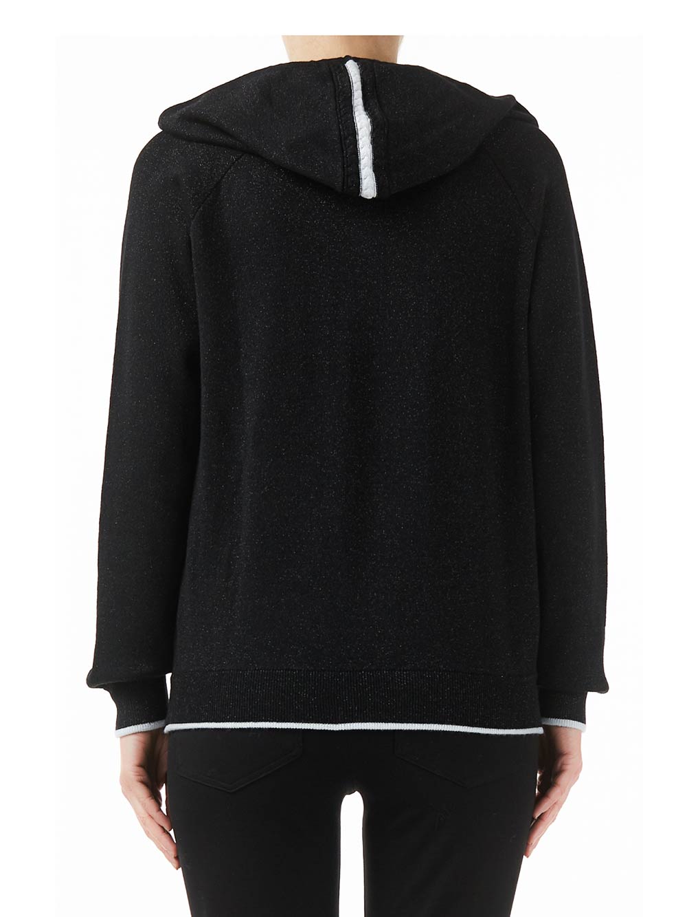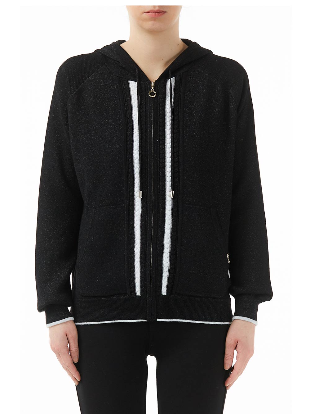 Completo sport nero donna composto da: giacca/maglia aperta con lavorazione lurex nero su nero, cappuccio con treccia centrale bianca, zip centrale argento su inserto bianco a contrasto con lavorazione a treccia, tasche a marsupio, maniche raglan, microprofili bianchi su polsini e fondo maglia; pantalone in felpa garzata doppiata, cinturino elastico in vita con laccetto regolabile, banda laterale in lurex, no tasche, polsino semidritto sul fondo + logo laterale bianco a contrasto.
