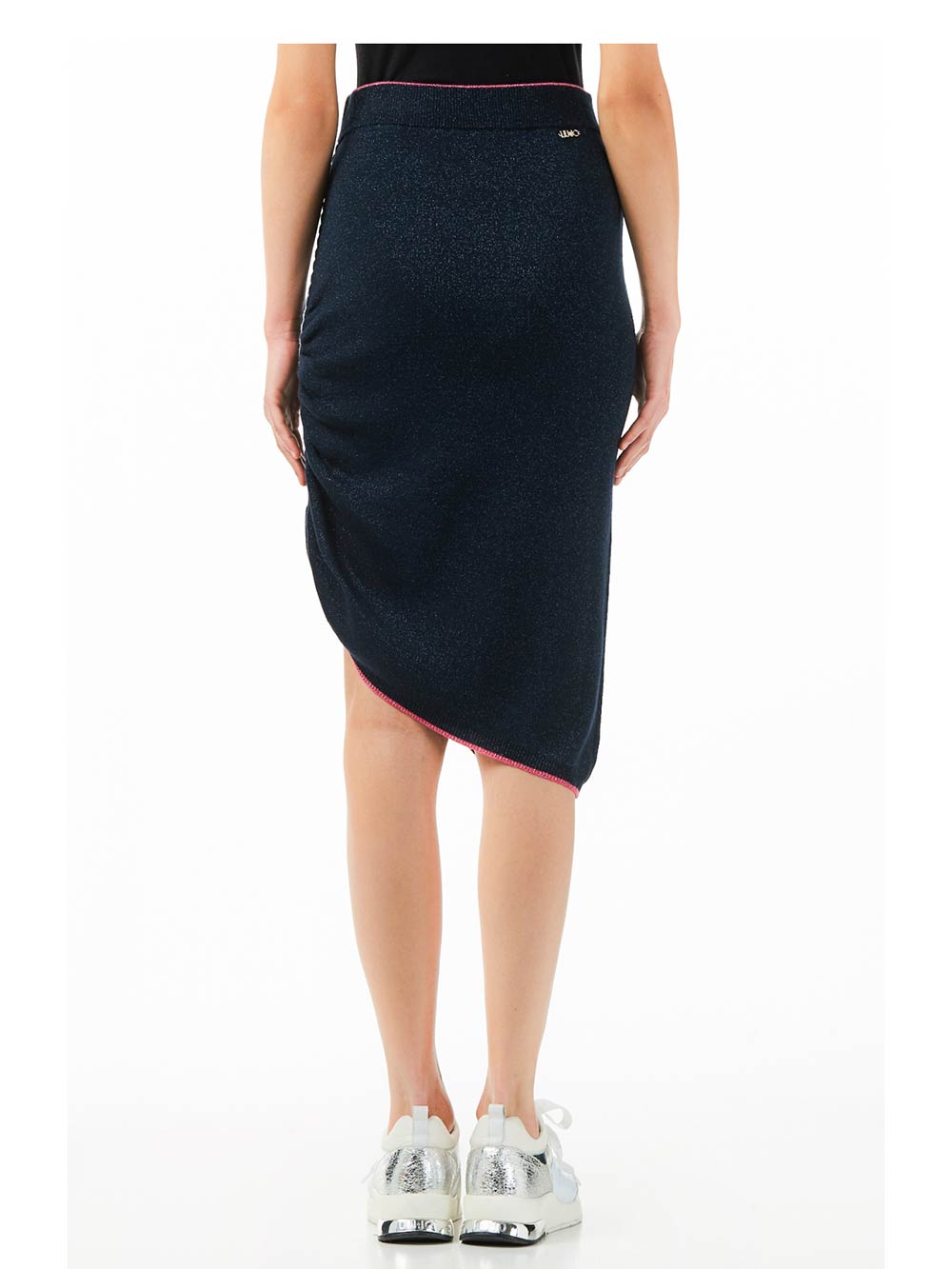 Completo/tailleur blu donna in maglia cascante + lurex tono su tono composto da: maglia girocollo, maniche raglan con polsino a coste sottogomito con finitura del fondo a ventaglio, parte dietro centrale banda bianca lurex rifinita con piccole trecce, microbordi fucsia su fondo maniche e girocollo; gonna longuette asimmetrica sul fondo, cinturino morbido punto vita, banda laterale a treccia con arricciatura che crea asimmetria, piccolo bordo fucsia su fondo e cinturino vita.