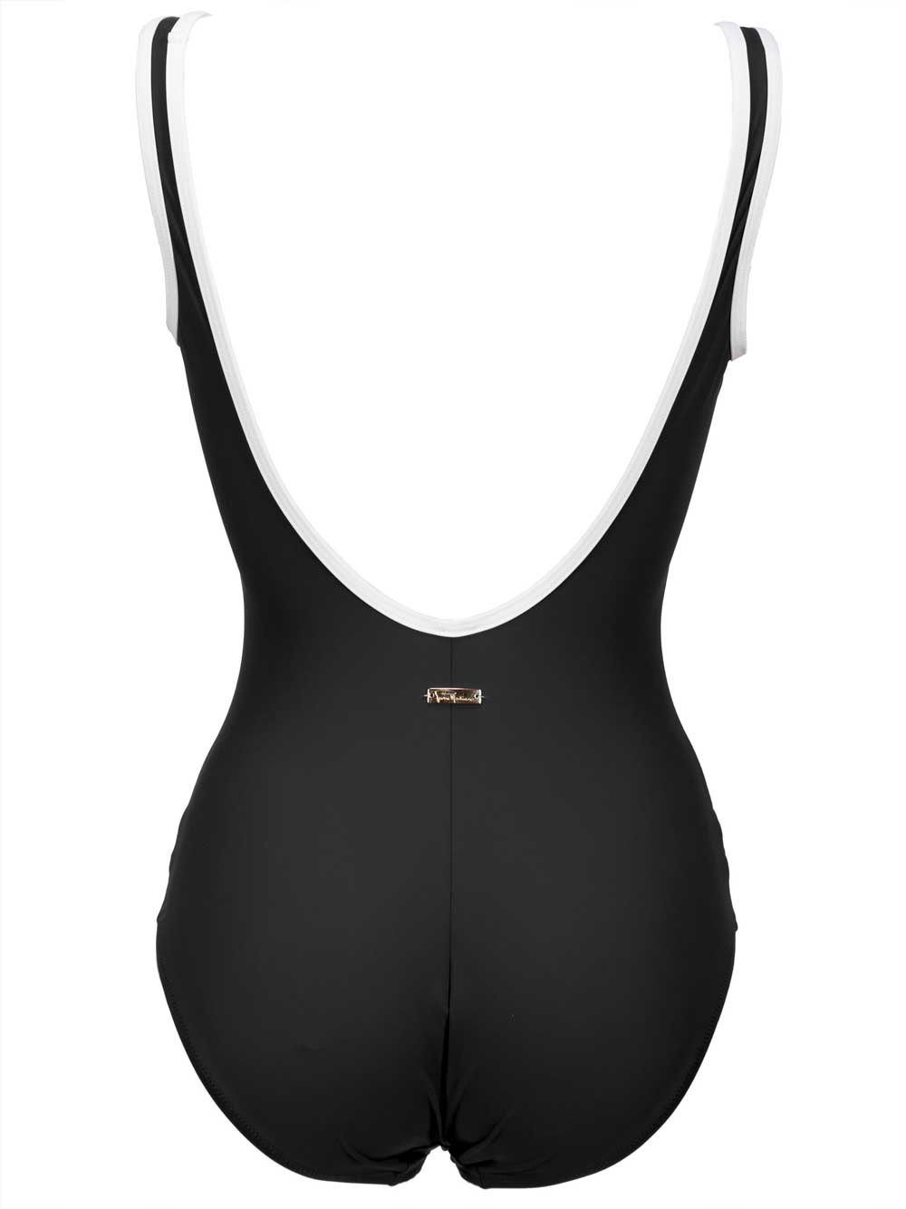 Costume intero donna nero in lycra opaca semi-contenitiva, taglio olimpionico, internamente tutto doppiato don forma di reggiseno con ferretto invisibile esterno, scollo medio sul dietro, tutto profilato di bianco sullo scollo rotondo davanti, sul giromaniche e sullo scollo del dietro, sul davanti in basso motivo di cintura fissa con fibbia tutta profilata in bianco stile anni ’60.