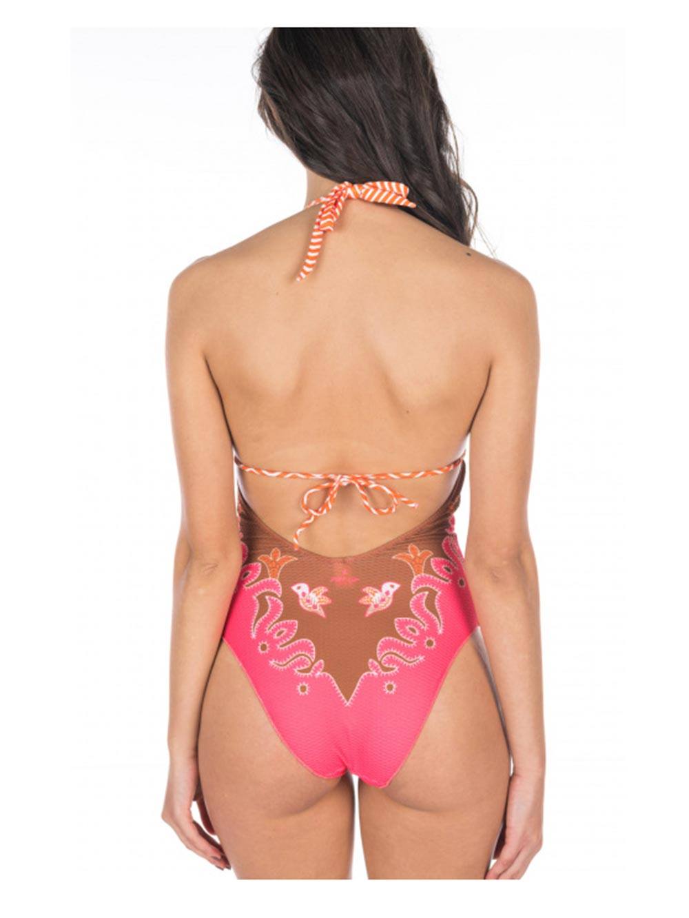 Costume donna intero/body esternabile fantasia indiana/henné sui toni caldi del rosa ciliegia/tabacco/arancio/bianco in lycra opaca con lavorazione microgeometrica + stampa, triangolo a scorrere con buona vestibilità e imbottitura estraibile, laccetto a scorrere sottoseno regolabile e allacciabile sul dietro, scollo sul retro, applicazione a forma geometrica sul davanti e sul bordo seno di borchiette metalliche dorate.