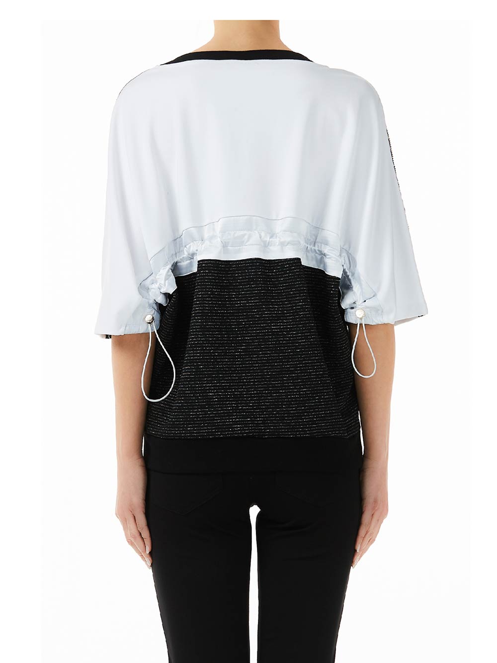 Felpa bicolor donna in misto viscosa, manica al gomito con taglio pipistrello, logo con lurex sulle spalle, inserto bianco sul davanti e dietro, parte bassa nera + lurex argento lavorazione a coste piatte bloccate, vestibilità over, taglio pari semi-corto.