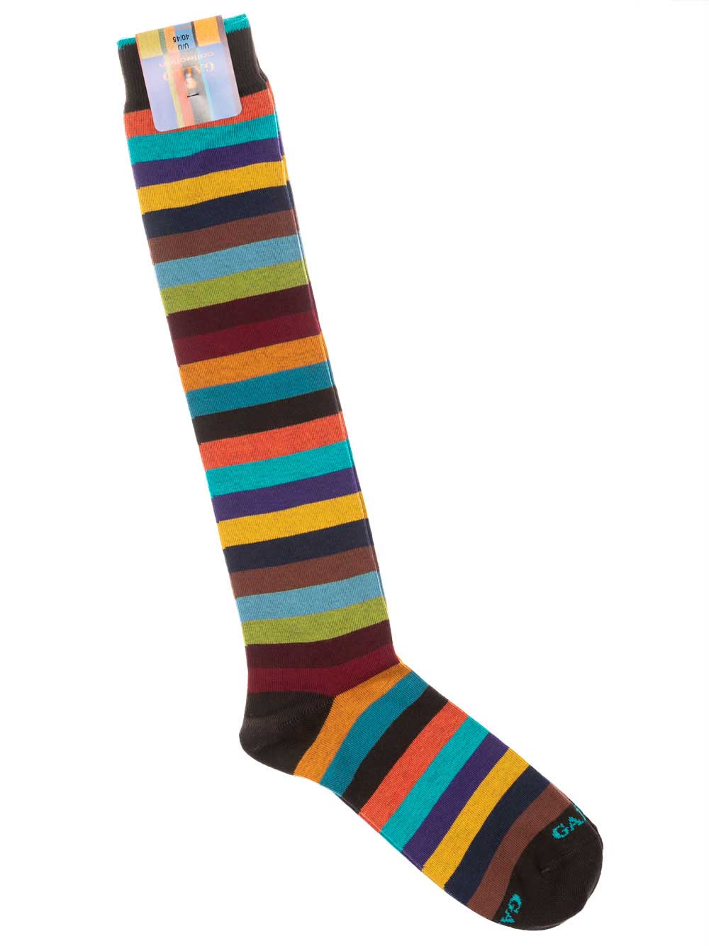 Calza donna gambaletto maglia rasata in caldo cotone elasticizzato, fantasia righe multicolor sui toni del marrone scuro/marrone bruciato/giallo/viola/turchese/aragosta/blu/bordeaux . Scritta “Gallo” in punta in contrasto di colore. Modalità di lavaggio: Lavare a mano o in lavatrice a temperatura massimo 40°, lavare a secco, no candeggio, asciugatura non a tamburo, non stirare. Taglia unica 36-40.