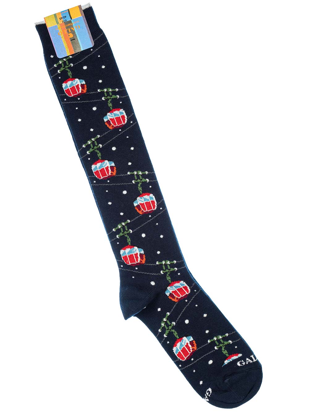 Calza uomo gambaletto maglia rasata in caldo cotone elasticizzato, fondo blu fantasia cabine funivia sui toni del rosso/celeste polvere/bianco/arancione. Scritta “Gallo” in punta in contrasto di colore. Modalità di lavaggio: Lavare a mano o in lavatrice a temperatura massimo 40°, lavare a secco, no candeggio, asciugatura non a tamburo, non stirare. Taglia unica 40-45.