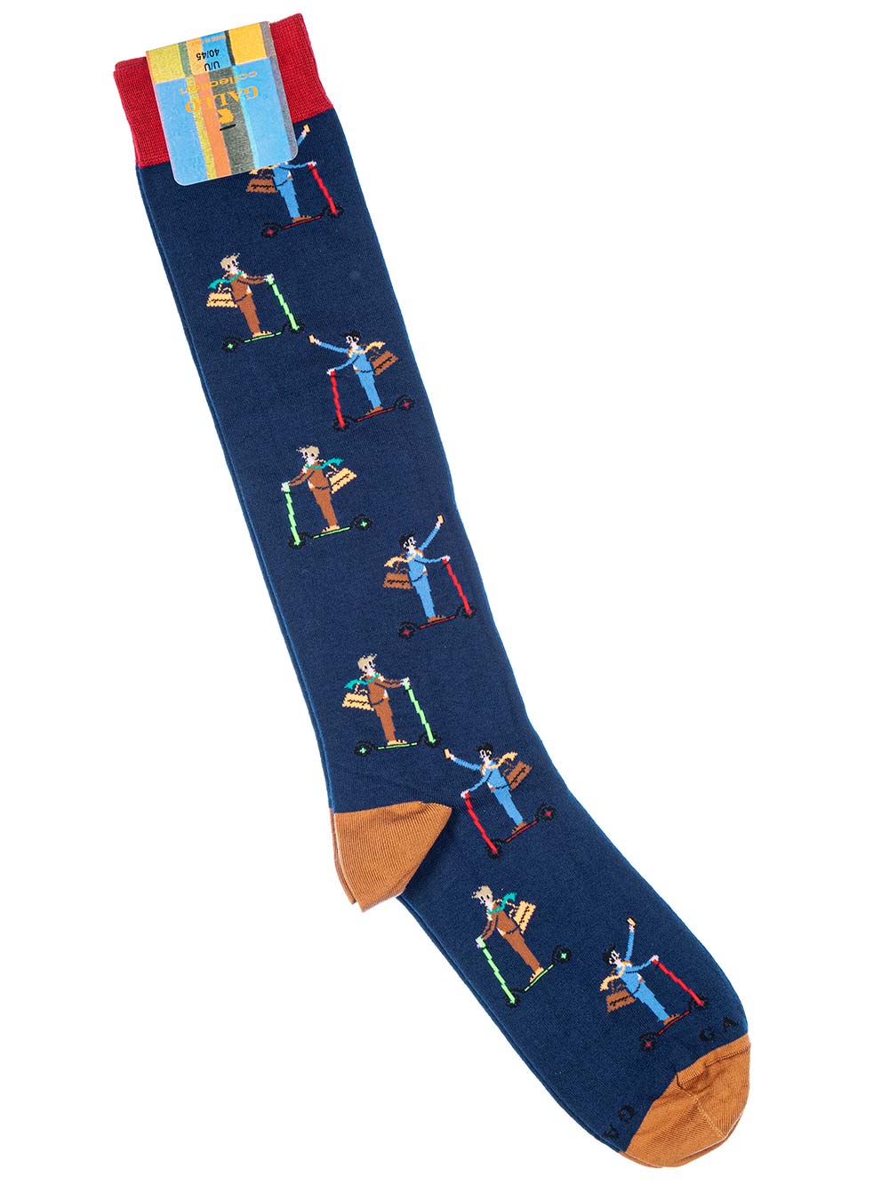 Calza uomo gambaletto maglia rasata in caldo cotone leggero elasticizzato, fondo blu fantasia monopattino sui toni del marrone bruciato/pervinca/arancio/verde acido/rosso. Scritta “Gallo” in punta in contrasto di colore. Modalità di lavaggio: Lavare a mano o in lavatrice a temperatura massimo 40°, lavare a secco, no candeggio, asciugatura non a tamburo, non stirare. Taglia unica 40-45.