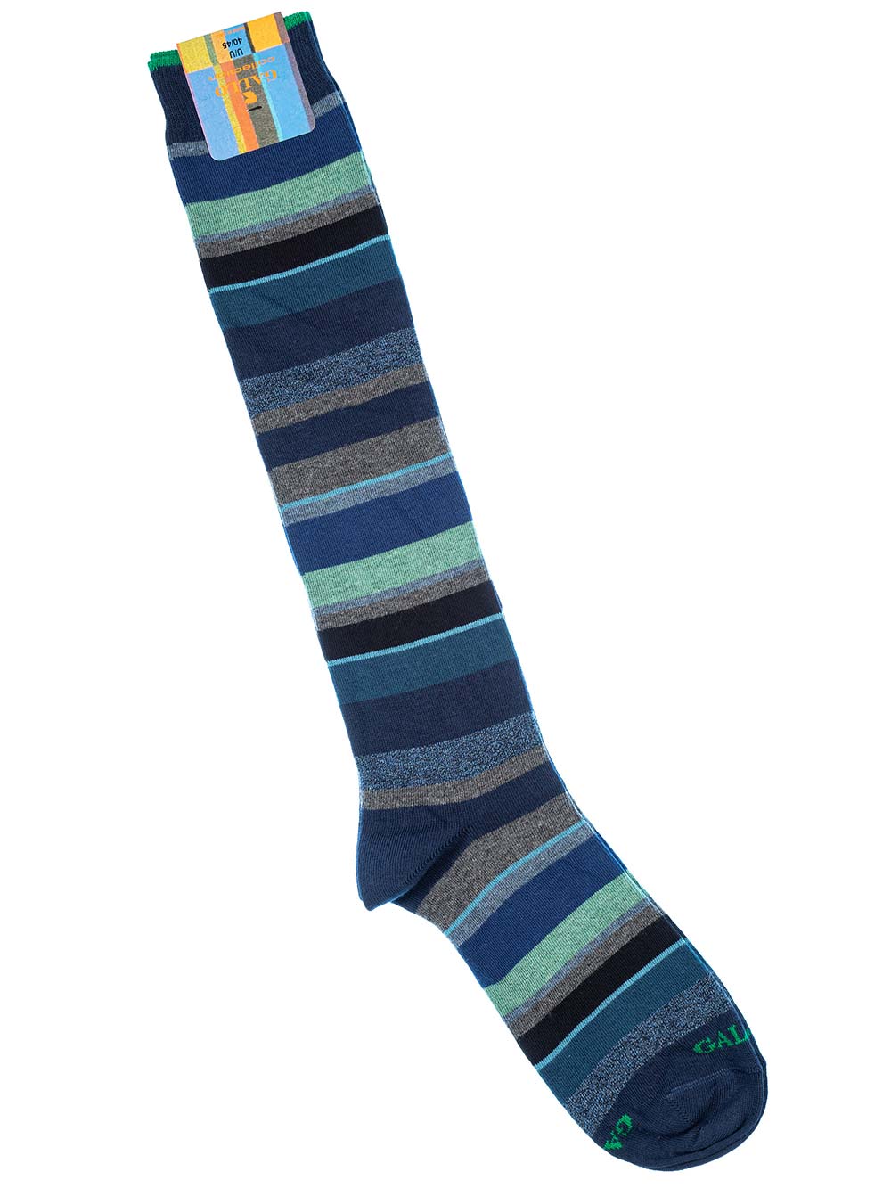 Calza uomo gambaletto maglia rasata in caldo cotone elasticizzato, fantasia righe mix multicolor sui toni del blu/denim/petrolio/grigio melange/verde melange. Scritta “Gallo” in punta in contrasto di colore. Modalità di lavaggio: Lavare a mano o in lavatrice a temperatura massimo 40°, lavare a secco, no candeggio, asciugatura non a tamburo, non stirare. Taglia unica 40-45.