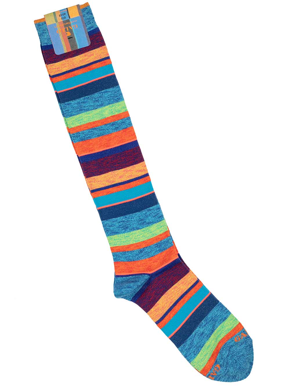 Gambaletto uomo in filo di scozia fantasia righe multicolor sui toni dell’azzurro melange/blu/verde-lime melange/arancio melange/cipolla melange, taglia unica 40-45.