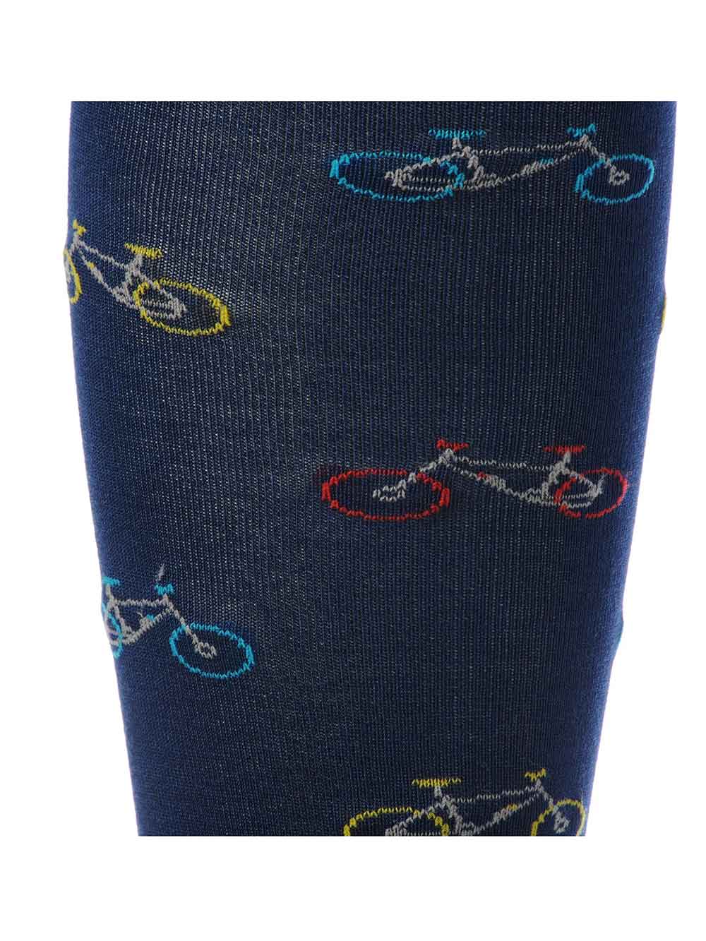 Calzino uomo gambaletto in cotone filo di scozia superlight elasticizzato, punta rimaglio a mano, massima estensione e superficie sottile. Taglia unica 40-45. Fantasia biciclette su fondo blu. Collezione primavera estate 2018.