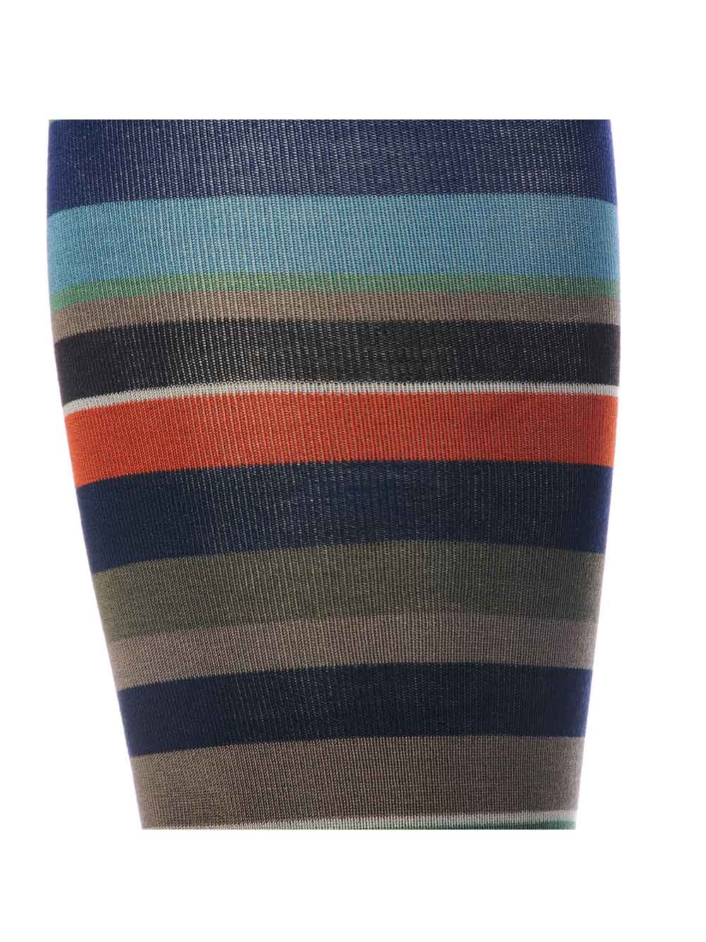 Calzino uomo gambaletto in filo di scozia elasticizzato, fantasia multirighe sui toni del blu/azzurro/corda/rosso scuro, taglia unica 40-45. Collezione primavera estate 2018.
