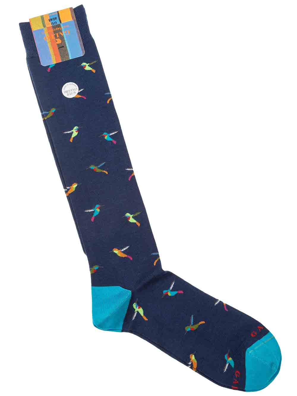 Calza uomo gambaletto in filo di scozia superleggero, fondo blu fantasia colibrì sui toni del giallo/turchese/fucsia/verde oliva/verde lime/arancio. Scritta “Gallo” in punta in contrasto di colore. Modalità di lavaggio: Lavare a mano o in lavatrice a temperatura massimo 40°, no candeggio, asciugatura non a tamburo, non stirare. Taglia unica 40-45.