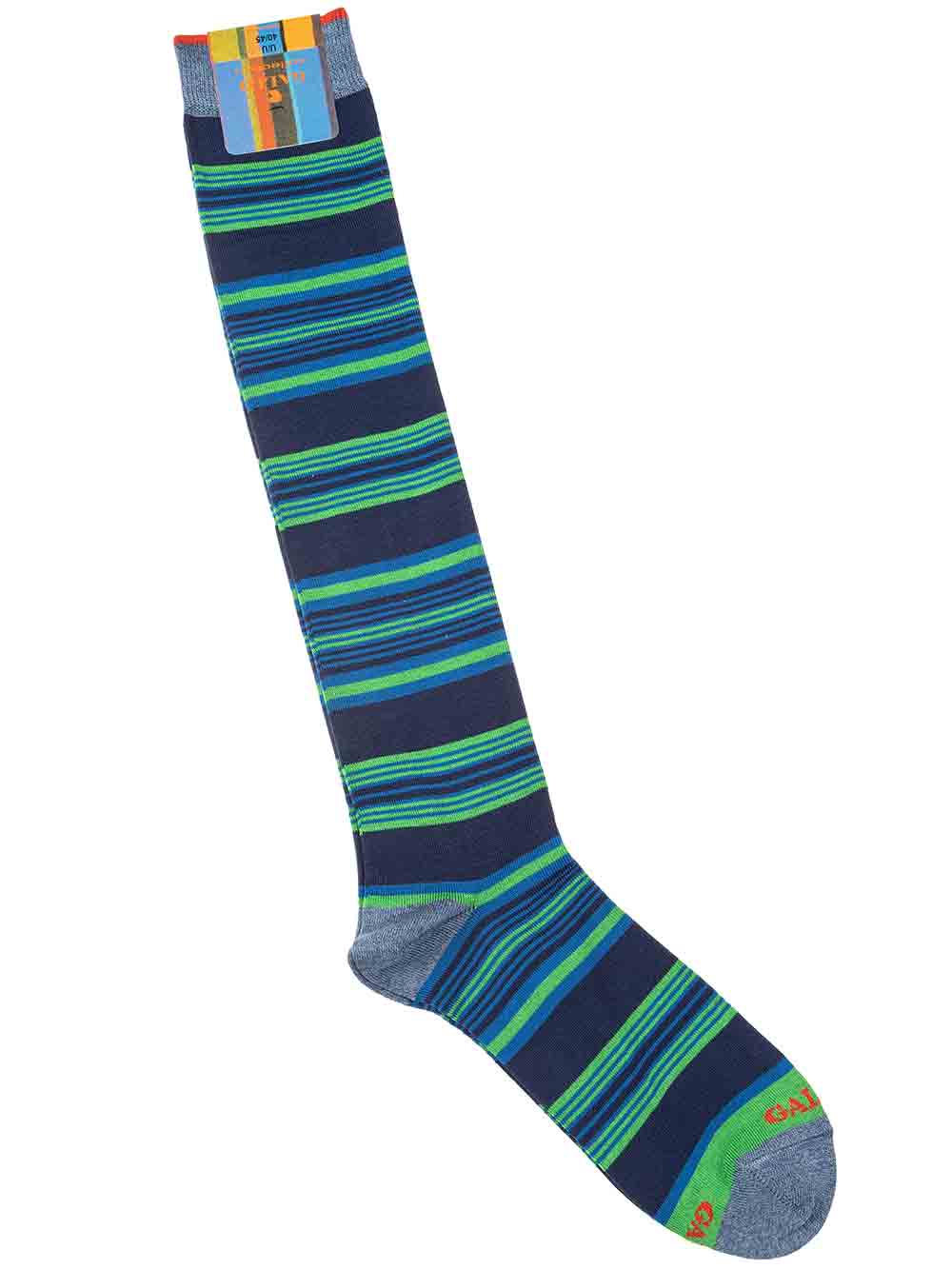 Calza uomo gambaletto in filo di scozia, fantasia macro-micro righe sui toni del blu/azzurro/verde brillante. Scritta “Gallo” in punta in contrasto di colore. Modalità di lavaggio: Lavare a mano o in lavatrice a temperatura massimo 40°, no candeggio, asciugatura non a tamburo, non stirare. Taglia unica 40-45.