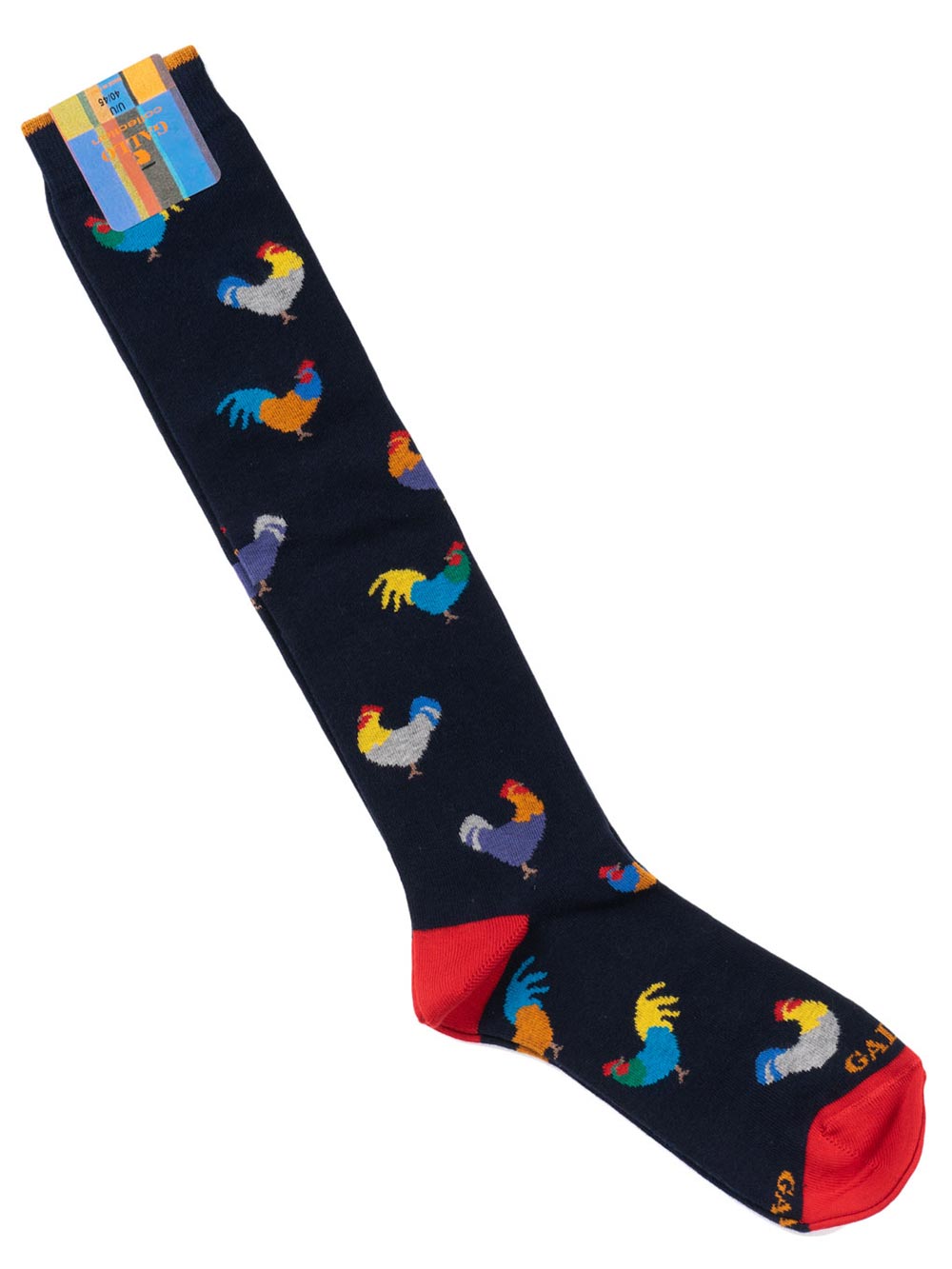 Calza uomo gambaletto maglia rasata in caldo cotone elasticizzato, fantasia galli multicolor su fondo blu. Scritta “Gallo” in punta in contrasto di colore. Modalità di lavaggio: Lavare a mano o in lavatrice a temperatura massimo 40°, lavare a secco, no candeggio, asciugatura non a tamburo, non stirare. Taglia unica 40-45. Collezione autunno inverno 2018.