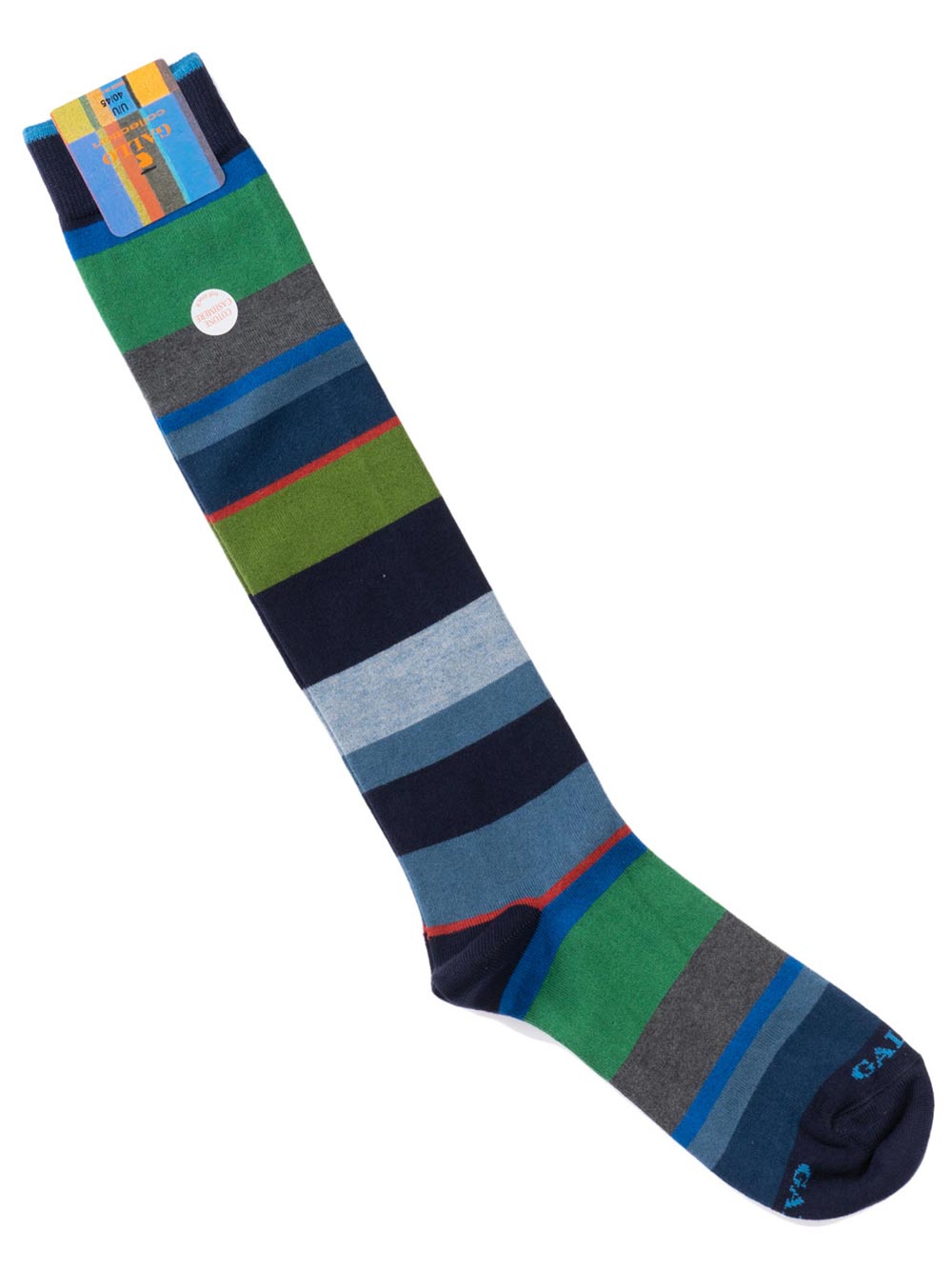 Calza uomo gambaletto in caldo cotone e cachemire mano calda e morbida, fantasia macrorighe multicolor sui toni del blu, polvere, celeste melange, verde erba, grigio e verde bandiera. Scritta “Gallo” in punta in contrasto di colore. Modalità di lavaggio: Lavare a mano o in lavatrice a temperatura massimo 40°, lavare a secco, no candeggio, asciugatura non a tamburo, non stirare. Taglia unica 40-45. Collezione autunno inverno 2018.