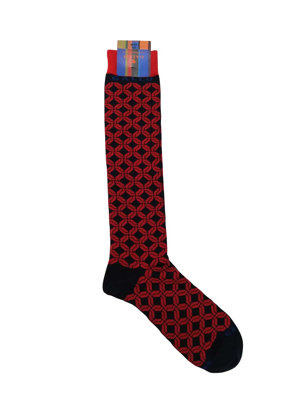 Calza uomo gambaletto maglia rasata in filo di scozia, fantasia maioliche sui toni del rosso/blu. Scritta “Gallo” in punta in contrasto di colore. Modalità di lavaggio: Lavare a mano o in lavatrice a temperatura massimo 40°, no candeggio, asciugatura non a tamburo, non stirare. Taglia unica 40-45.
