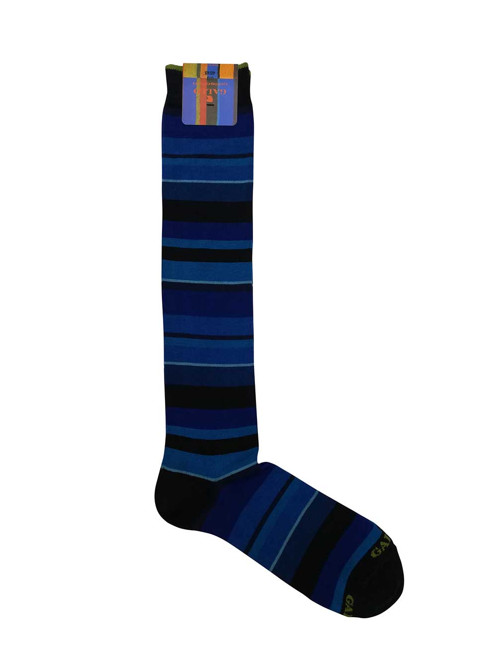 Calza uomo gambaletto maglia rasata in filo di scozia, fantasia righe multicolor sui toni del blu scuro/blu oceano/bluette/azzurro chiaro/azzurro scuro. Scritta “Gallo” in punta in contrasto di colore. Modalità di lavaggio: Lavare a mano o in lavatrice a temperatura massimo 40°, no candeggio, asciugatura non a tamburo, non stirare. Taglia unica 40-45.