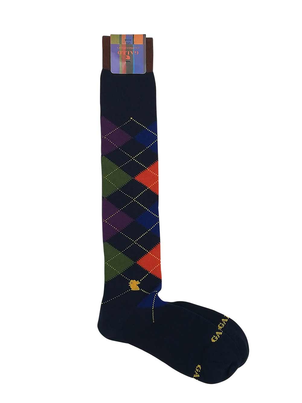 Calza uomo gambaletto maglia rasata in caldo cotone elasticizzato, fondo blu fantasia rombi sui toni dell’arancio/bluette/viola/verde erba più “Gallo” giallo. Scritta “Gallo” in punta in contrasto di colore. Modalità di lavaggio: Lavare a mano o in lavatrice a temperatura massimo 40°, lavare a secco, no candeggio, asciugatura non a tamburo, non stirare. Taglia unica 40-45.