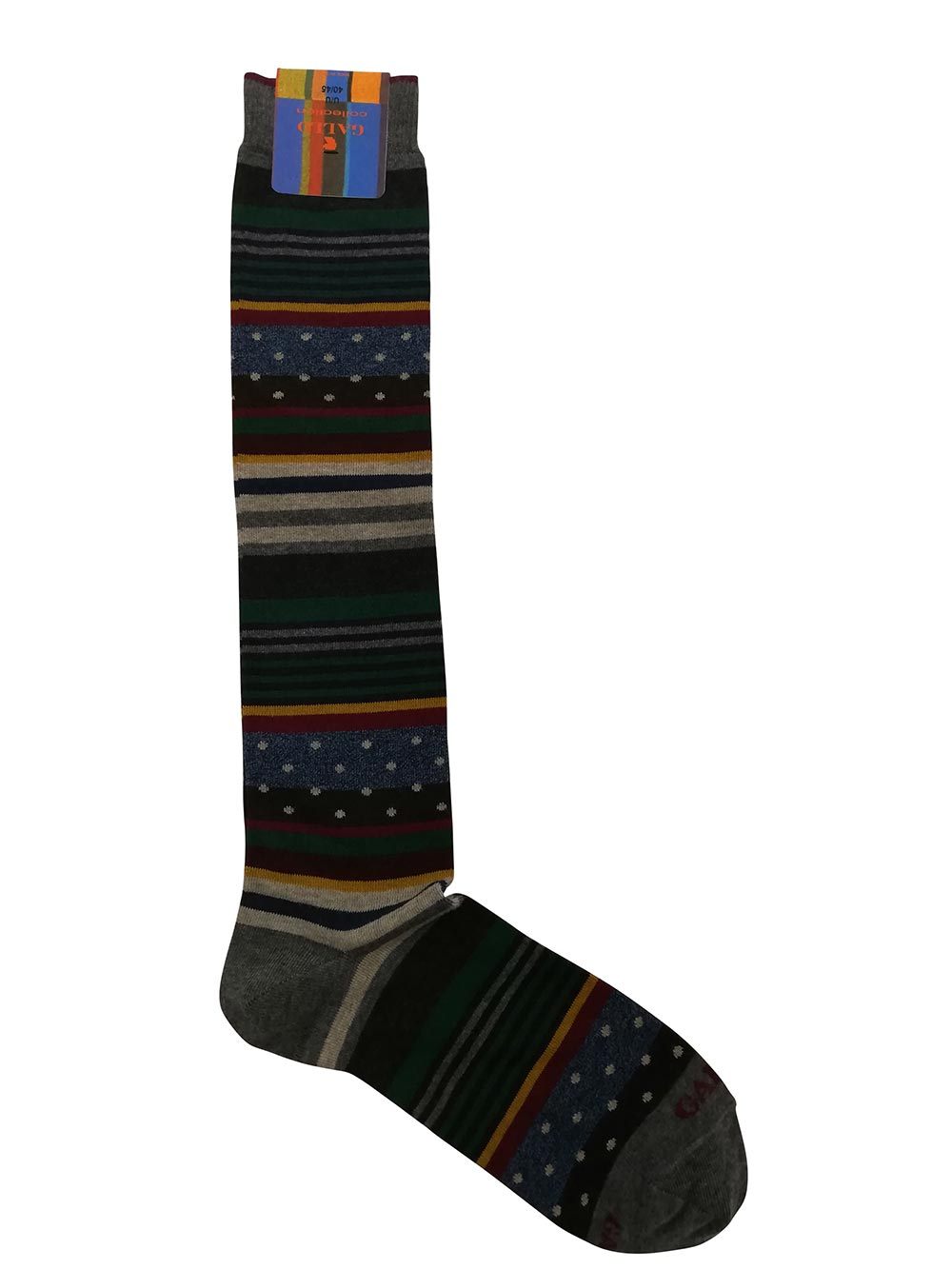 Calza uomo gambaletto maglia rasata in caldo cotone elasticizzato, fantasia righe multicolor/pois sui toni del grigio chiaro/grigio antracite/verde pino/giallo senape/marrone scuro/vinaccia/denim. Scritta “Gallo” in punta in contrasto di colore. Modalità di lavaggio: Lavare a mano o in lavatrice a temperatura massimo 40°, lavare a secco, no candeggio, asciugatura non a tamburo, non stirare.
