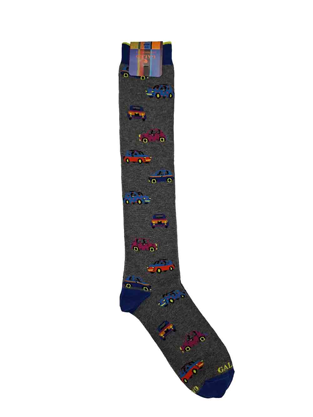Calza uomo gambaletto maglia rasata in caldo cotone elasticizzato, fondo grigio melange fantasia macchinine sui toni del bluette/azzurro/giallo/arancio/fucsia/nero. Scritta “Gallo” in punta in contrasto di colore. Modalità di lavaggio: Lavare a mano o in lavatrice a temperatura massimo 40°, lavare a secco, no candeggio, asciugatura non a tamburo, non stirare. Taglia unica 40-45.