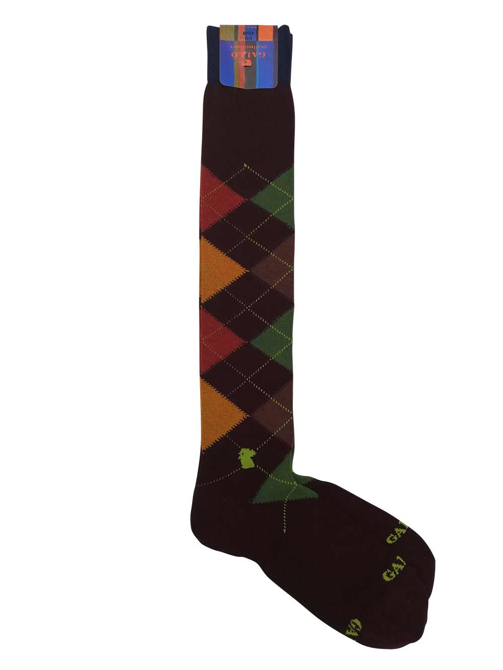 Calza uomo gambaletto maglia rasata in caldo cotone elasticizzato, fondo rosso fegato fantasia rombi sui toni del verde erba/marrone tabacco/rosso mattone/giallo intenso scuro più “Gallo” verde germoglio. Scritta “Gallo” in punta in contrasto di colore. Modalità di lavaggio: Lavare a mano o in lavatrice a temperatura massimo 40°, lavare a secco, no candeggio, asciugatura non a tamburo, non stirare. Taglia unica 40-45.