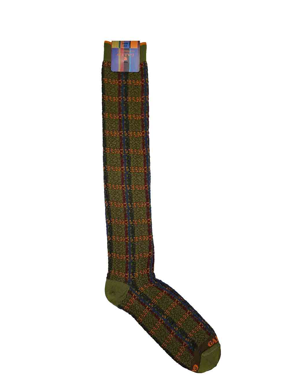 Calza uomo gambaletto maglia rasata in caldo cotone elasticizzato, fondo verde oliva fantasia quadri/jaquard sui toni dell’arancio/bordeaux/verde pino/verde militare/blu chiaro. Scritta “Gallo” in punta in contrasto di colore. Modalità di lavaggio: Lavare a mano o in lavatrice a temperatura massimo 40°, lavare a secco, no candeggio, asciugatura non a tamburo, non stirare. Taglia unica 40-45.