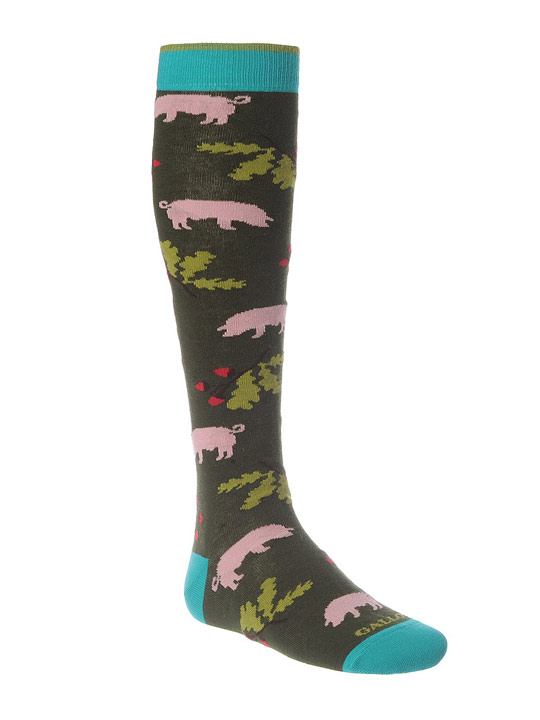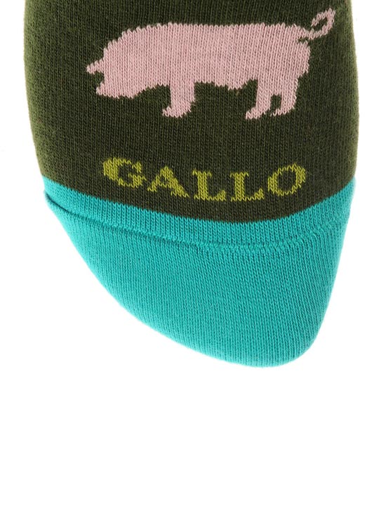 Calza uomo gambaletto in cotone elasticizzato fantasia maialini con ghiande. Scritta “Gallo” in punta in contrasto di colore come il bordo, la punta e tallone e la riga del polsino
