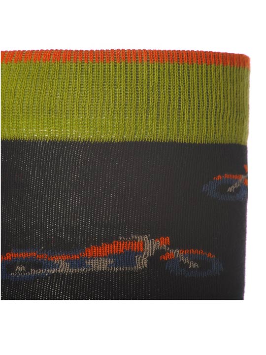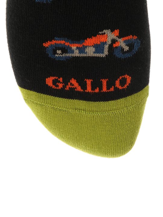 Calza uomo gambaletto in cotone elasticizzato fantasia motocicletta. Scritta “Gallo” in punta in contrasto di colore come il bordo, la punta e tallone e la riga del polsino