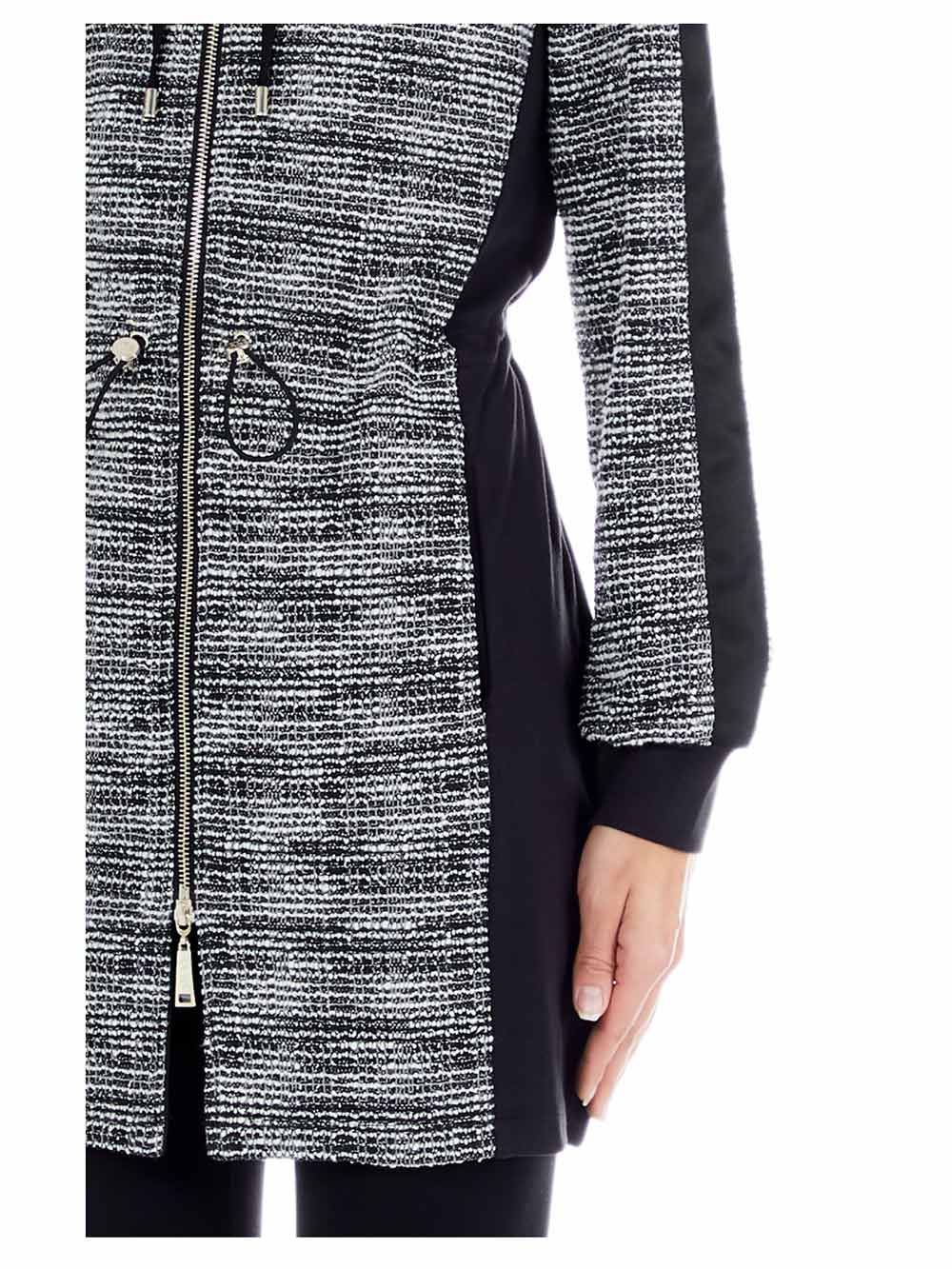 Giacca lunga/spolverino donna in bitessuto jersey modal nero/tweed elasticizzato stile Chanel nero-antracite-avorio. Aperta con cappuccio, zip doppio cursore, tasche sul davanti invisibili, laccetto per arricciatura punto vita. Bnada di strass luminosi sopra il seno.