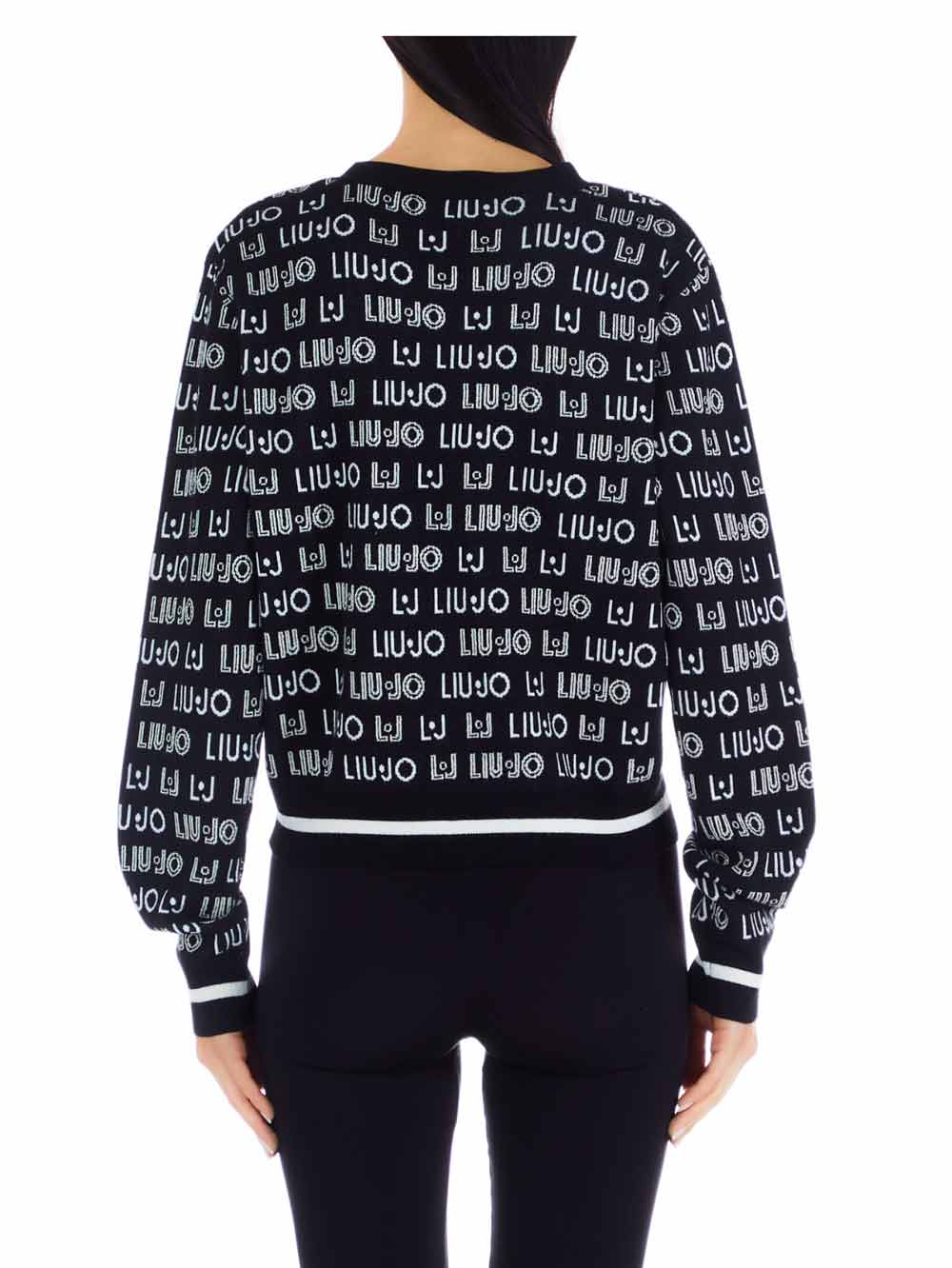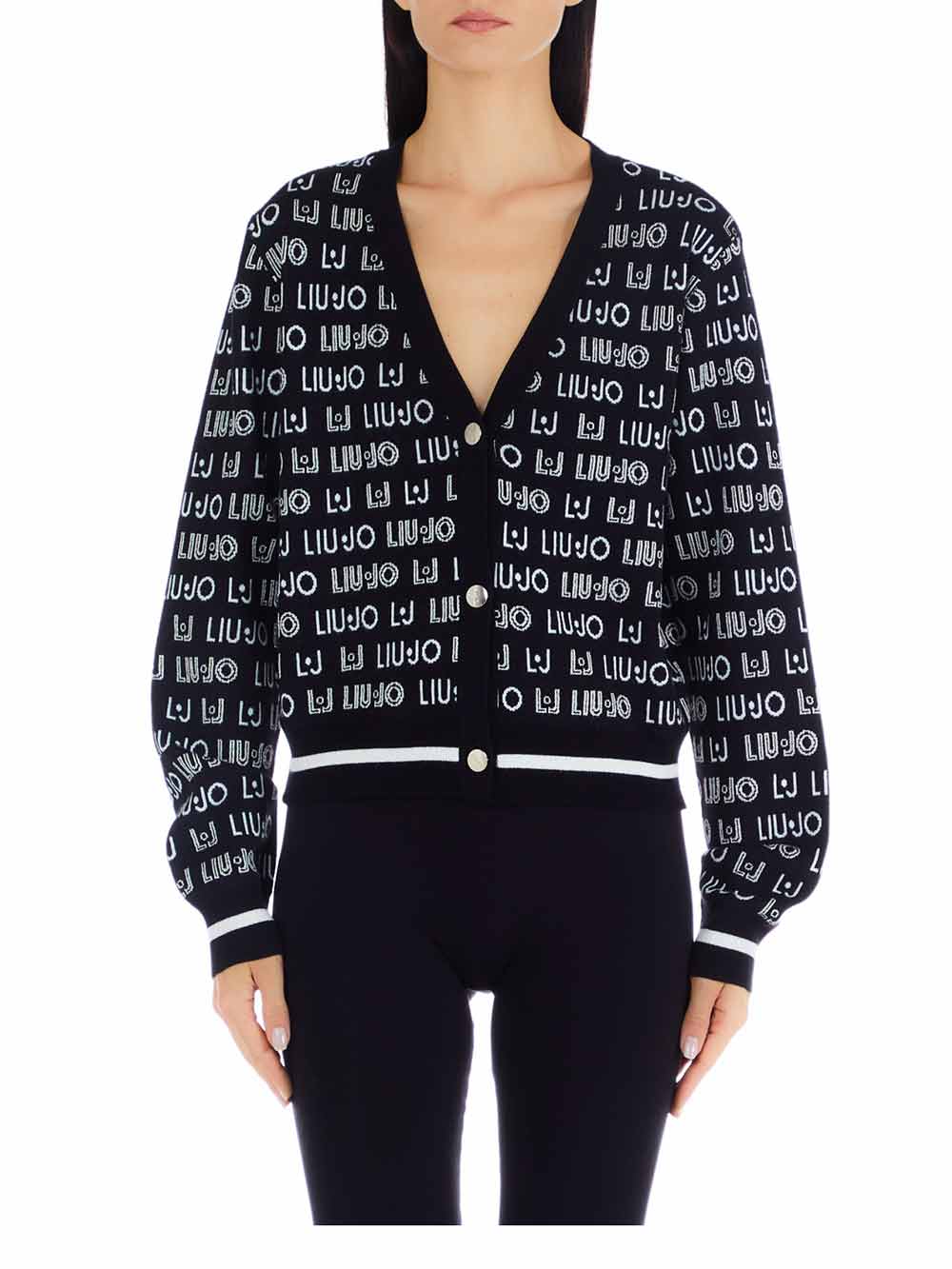Giacchino/maglia aperta donna fondo nero tutto logato in avorio/lurex doré in jersey di viscosa pesante e rasato, scollo a V con bottni gioiello dorati, linea semidritta. Sul fondo maglia e fondo maniche banda avorio/lurex dorè a contrasto.