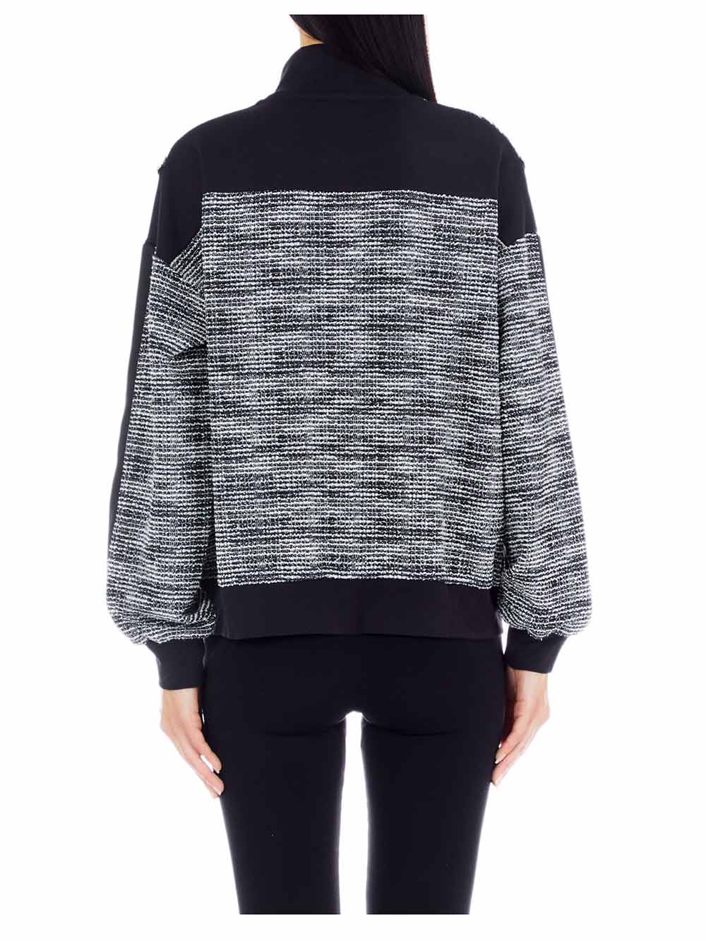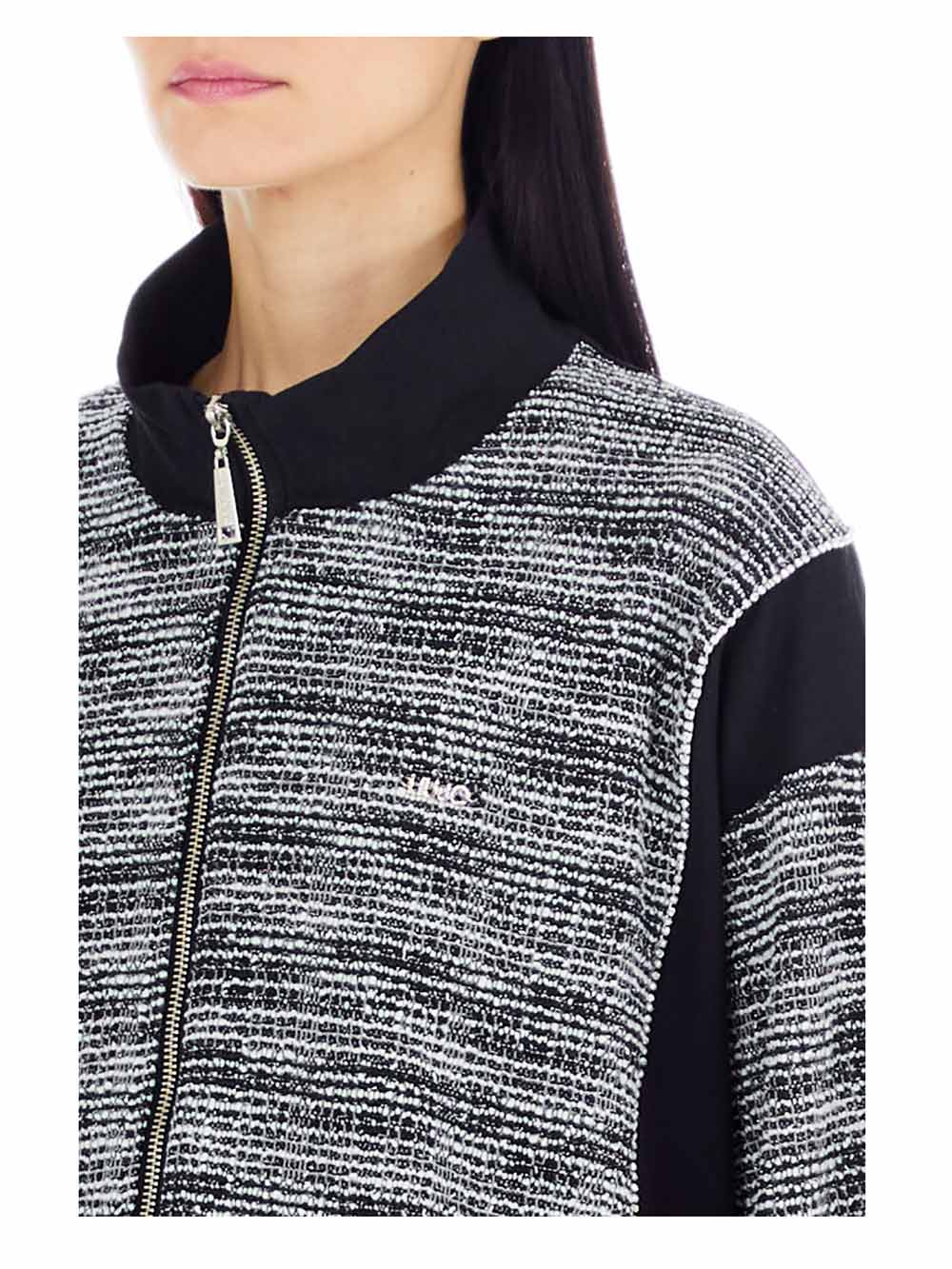 Giacchino sport donna in bitessuto jersey modal nero/tweed elasticizzato stile Chanel nero-antracite-avorio, aperto con zip oro, collo a lupetto, giromanica calato stile anni ’80. Parte davanti e dietro in tweed, laterale davanti in viscosa più banda di strass luminosi, tasche invisibili.