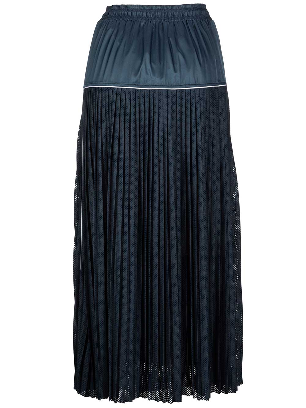 Gonna lunghezza caviglia donna in bi-tessuto: jersey microrete stile basket + raso lucido luminoso, cinturino vita arricciato morbido + laccetto regolabile, balza girofianco in raso morbido arricciato, parte bassa in jersey microrete tutta plissettata