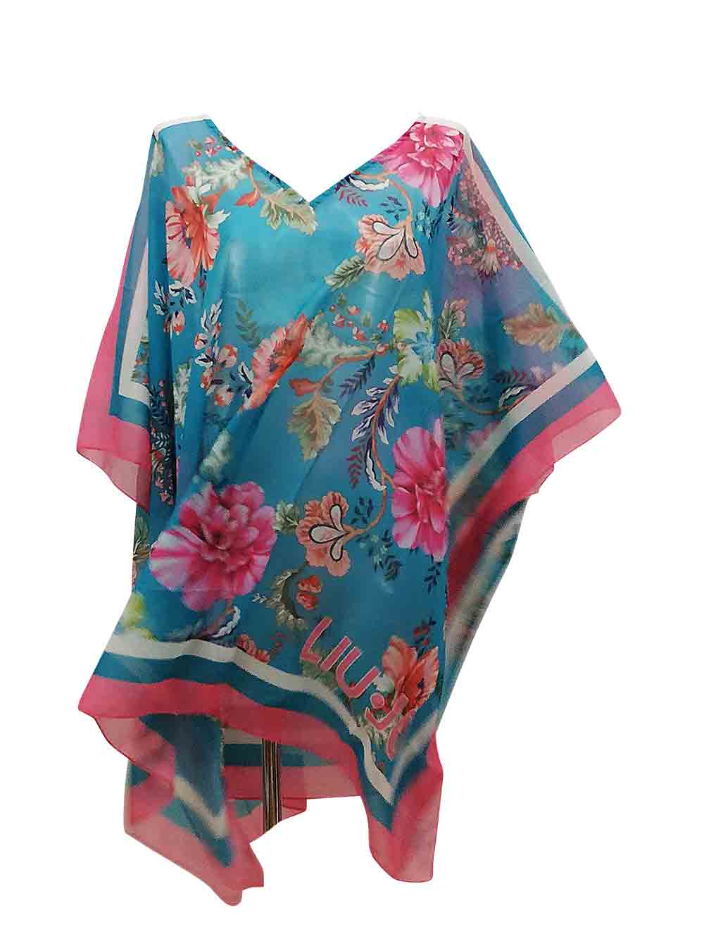 Kaftano/poncho donna fondo ottanio chiaro logato con fantasia macrofloreale rinascimentale sui toni del verde salvia/verde bosco/verde lime/azzurro/tabacco/ruggine/rosa salmone/corallo/rosa chiaro/fucsia/bordeaux in cascante e morbido satin, scollo a V, pari sui laterali effetto foulard, cucitura sui laterali.