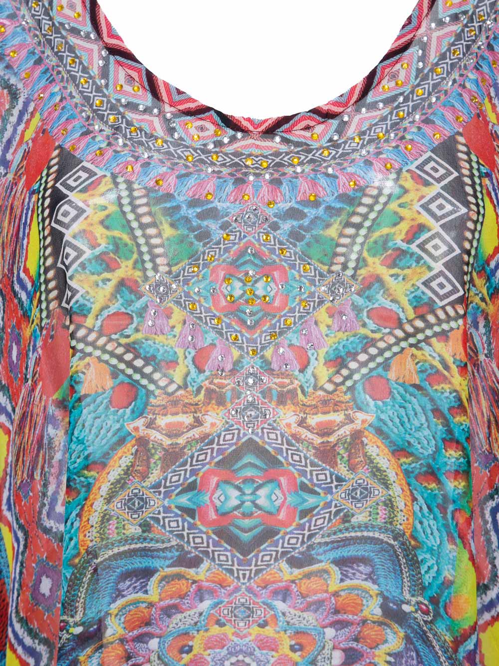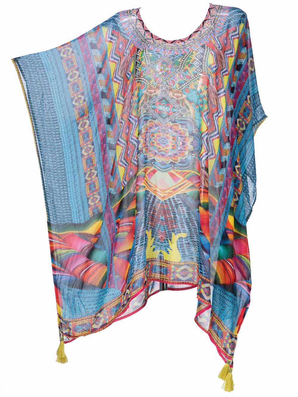 Kaftano donna in georgette cascante con ricca stampa indiana sui toni dell’arcobaleno, scollo tondo profondo, rifinito con strass sui toni del bianco/giallo, cuciture laterali, frappe sulle punte.