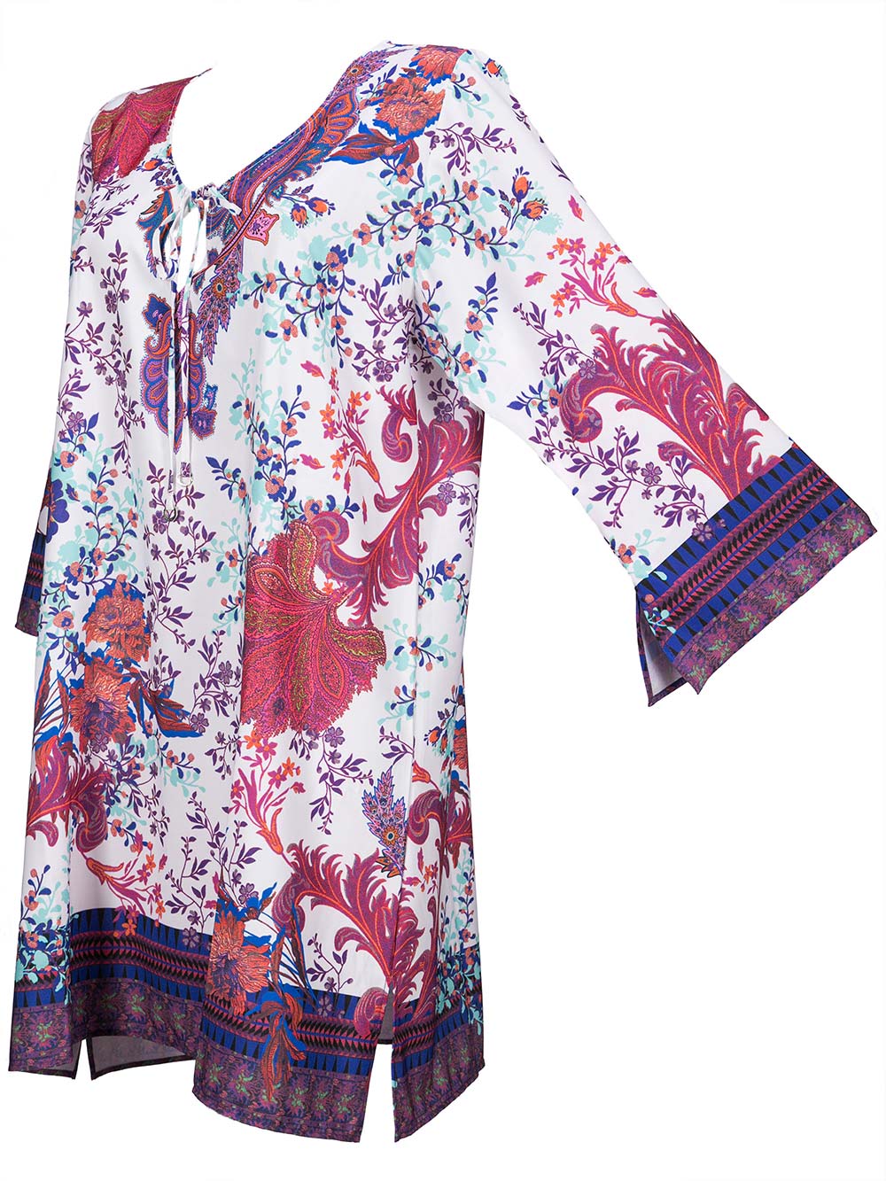 Abitino/kaftano donna in tessuto stampato sui toni del bianco/verde menta/azzurro/arancio/rosa/fucsia, linea molto comoda, manica 3/4 morbida con spacchetto, scollo a V sul davanti con laccetto di chiusura, forma leggermente a trapezio sul fondo con spacchetti.